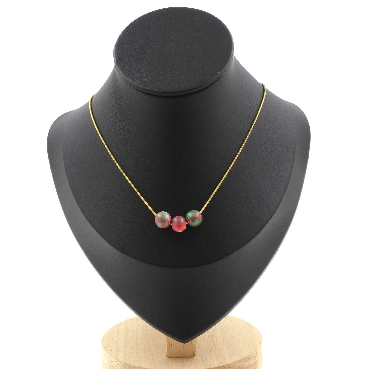 Collier 3 perles Jaspe vert rouge 8 mm. Chaine en acier doré inoxydable
