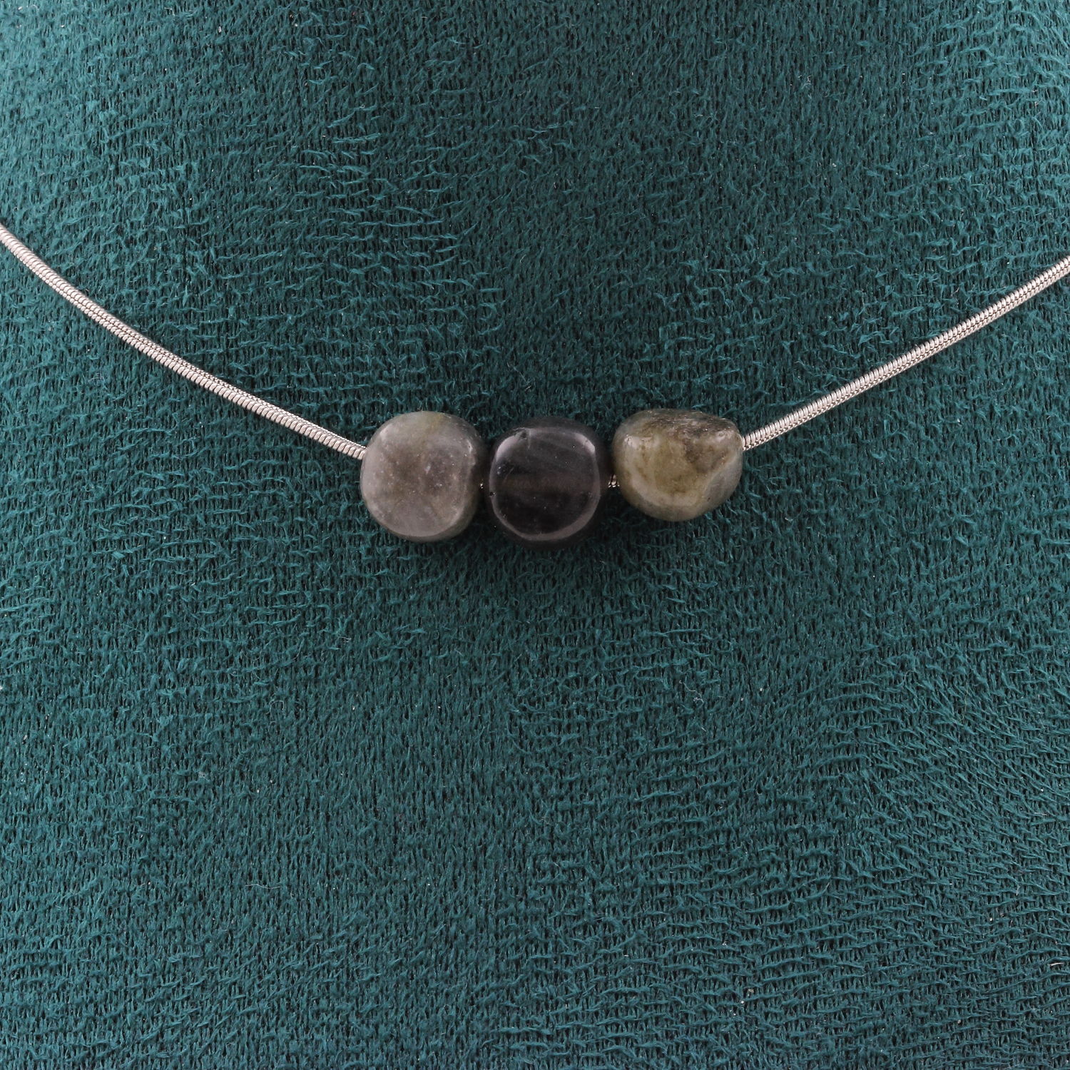 Collier 3 perles Labradorite de Finlande. Chaine en acier inoxydable