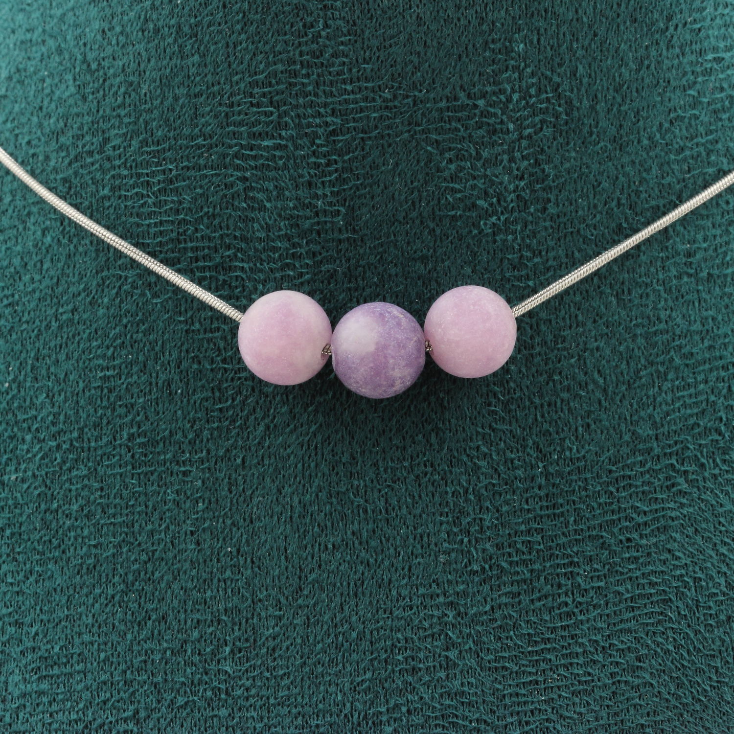 Collier 3 perles Mica violet mat 8 mm chaine en acier inoxydable longueur 45 cm. Nous pouvons le fabriquer à votre longueur sur demande. Fabriqué en France dans notre atelier A Bijoux.