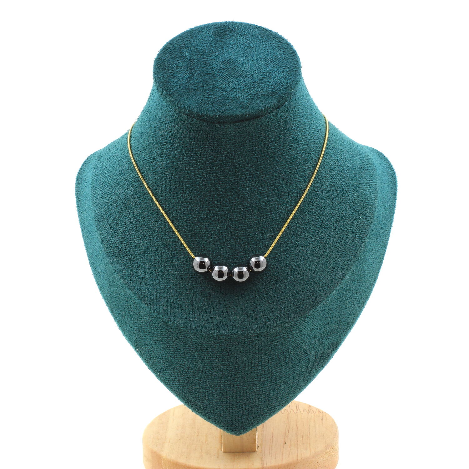 Collier 4 perles Hématite 8 mm. Chaine en acier doré inoxydable