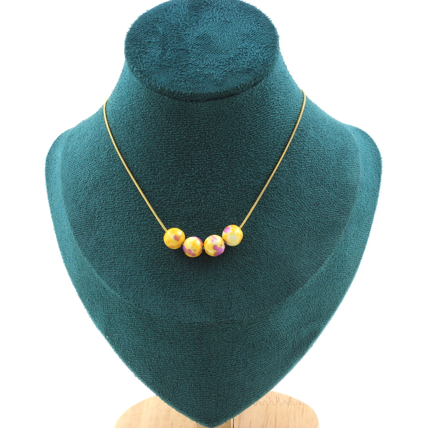 Collier 4 perles Jaspe jaune violet 8 mm. Chaine en acier doré inoxydable