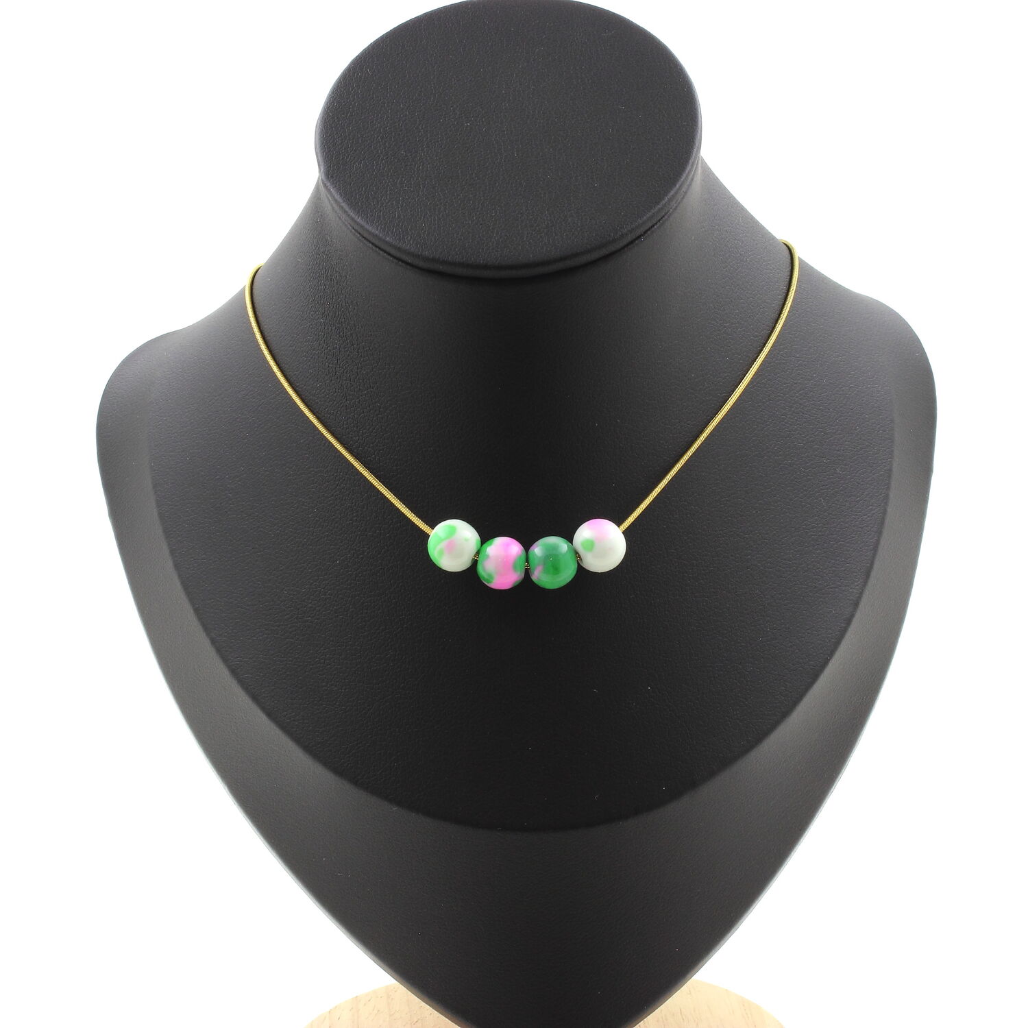 Collier 4 perles Jaspe rose vert 8 mm chaine en acier doré inoxydable longueur 45 cm. Nous pouvons le fabriquer à votre longueur sur demande. Fabriqué en France dans notre atelier A Bijoux.