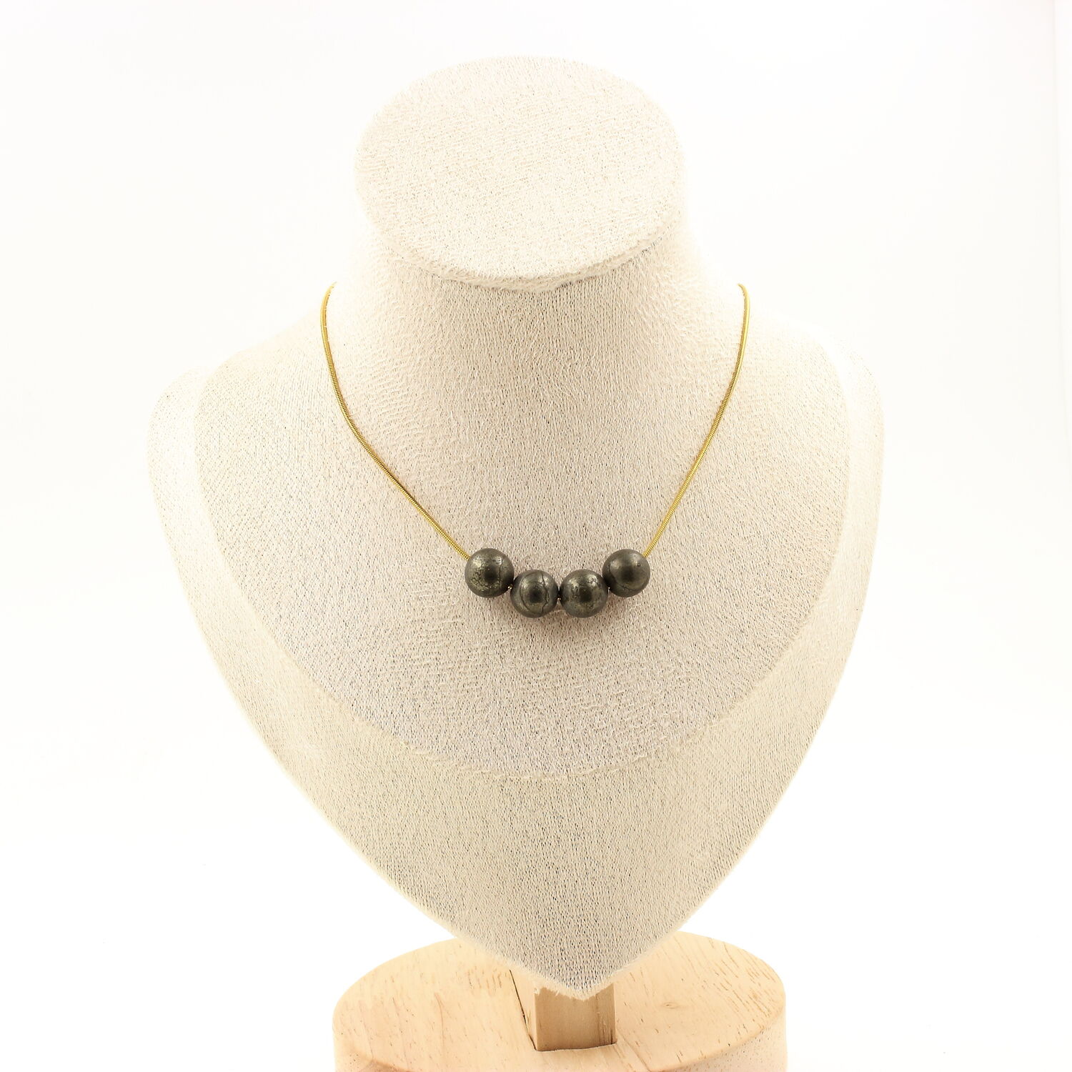 Collier 4 perles Pyrite d'Espagne 8 mm chaine en acier doré inoxydable longueur 45 cm. Nous pouvons le fabriquer à votre longueur sur demande. Fabriqué en France dans notre atelier A Bijoux.