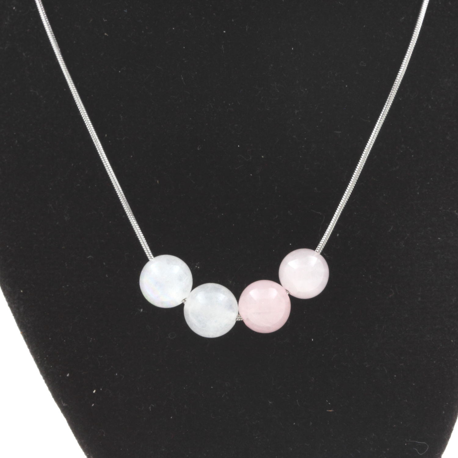 Collier 4 perles Quartz rose + Pierre de lune 8 mm chaine en acier inoxydable ( longueur 40, 45, 50, 55, 60, 70, 80, 90 cm au choix ).