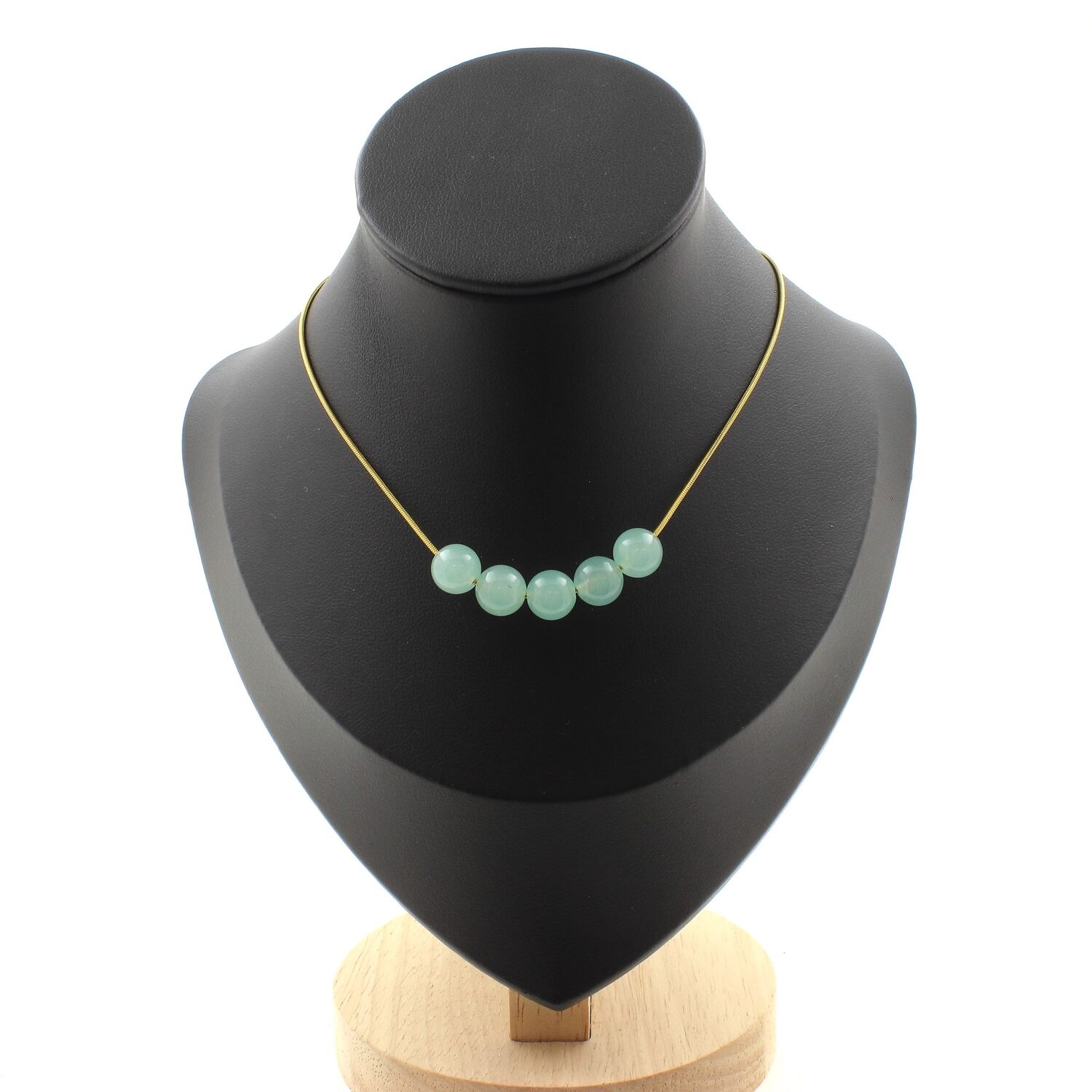 Collier 5 perles Angélite 8 mm. Chaine en acier doré inoxydable