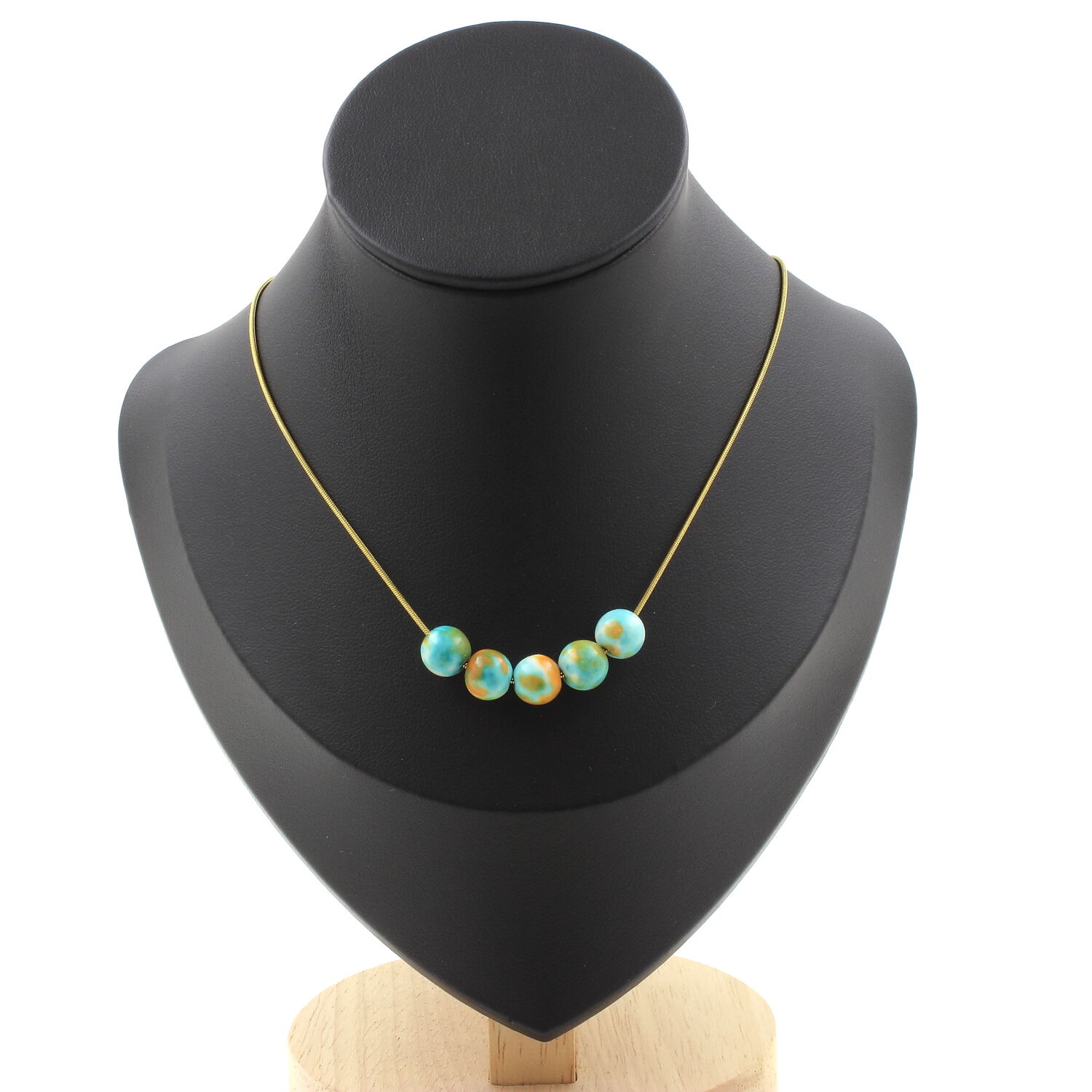 Collier 5 perles Jaspe bleu orange 8 mm. Chaine en acier doré inoxydable