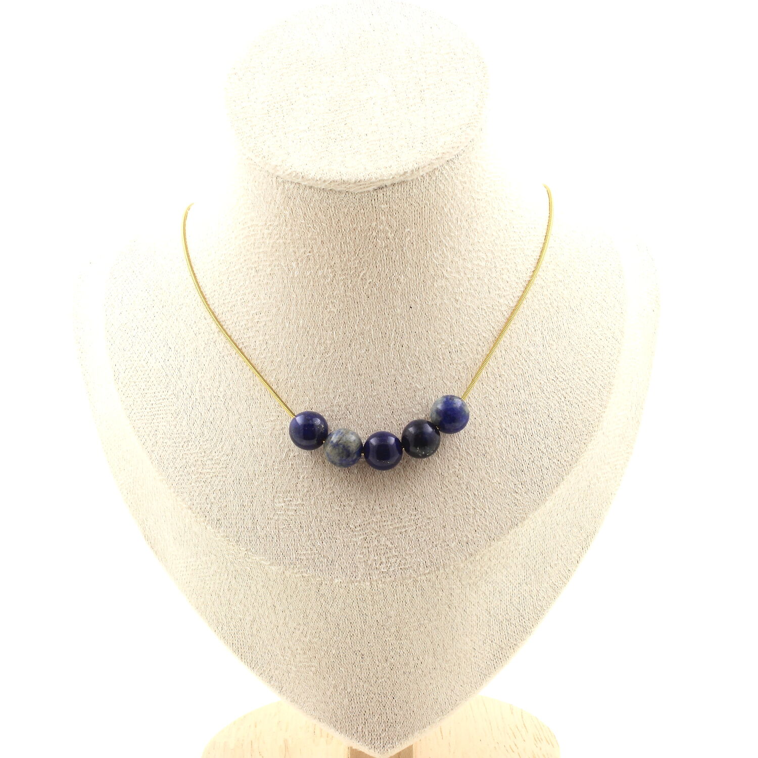 Collier 5 perles Lapis Lazuli 8 mm. Chaine en acier doré inoxydable