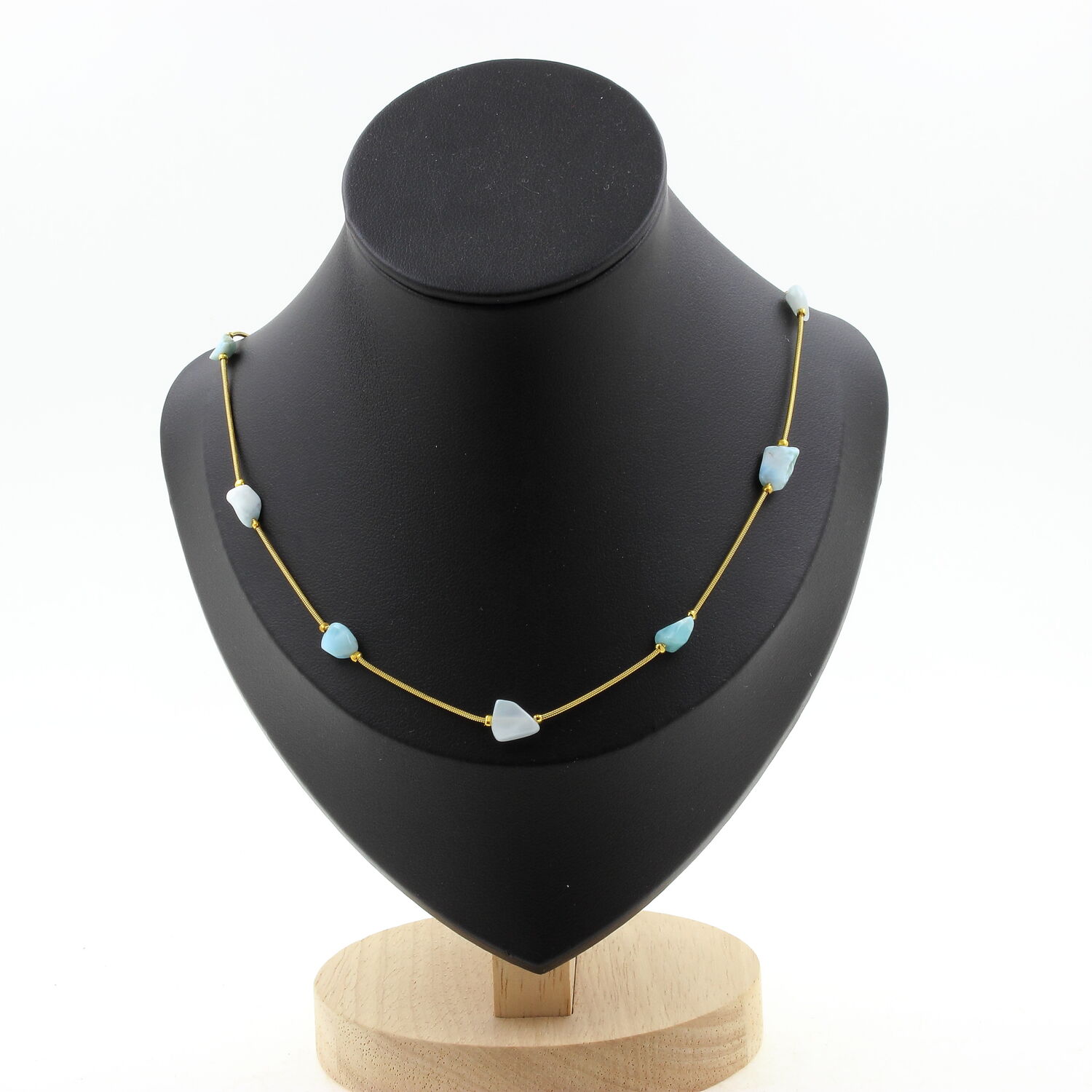 Collier 9 Perles Larimar de République Dominicaine de forme libre 5 mm-8 mm chaine en acier doré inoxydable longueur 45 cm. Nous pouvons le fabriquer à votre longueur sur demande. Fabriqué en France dans notre atelier A Bijoux.