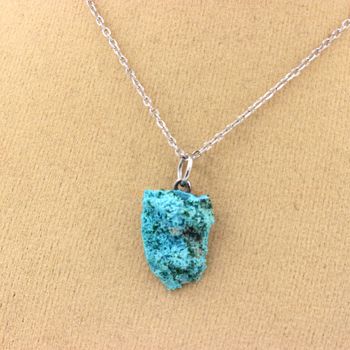 Collier Chrysocolle brut + chaine en acier inoxydable longueur 40, 45, 50, 55, 60, 70, 80, 90 cm au choix. Chrysocolle en provenance de Kipushi Mine, Kipushi, Kipushi Territory, Haut-Katanga, DR Congo. Fabriqué en France dans notre atelier A Bijoux.