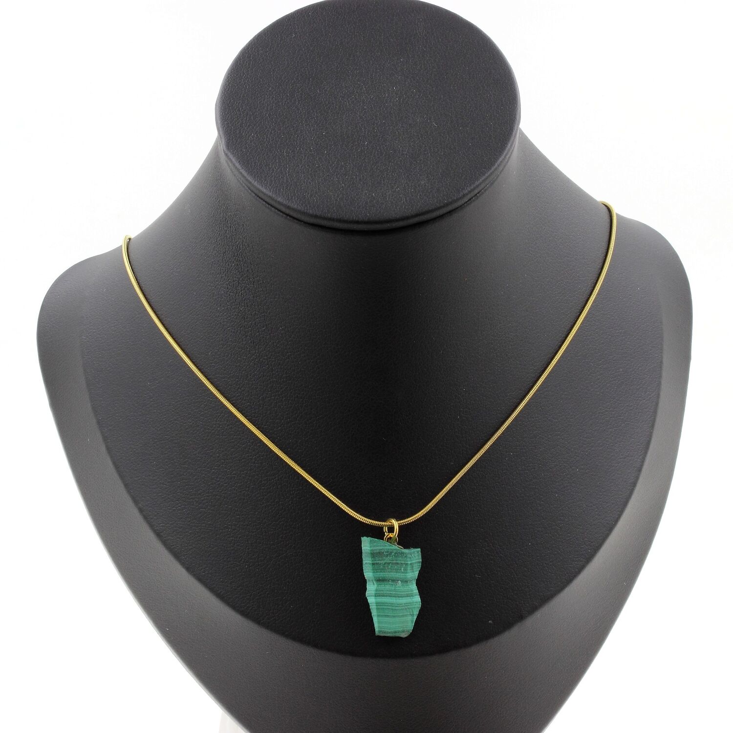 Collier Malachite brut Pièce unique + chaine en acier doré inoxydable longueur 45 cm. Nous pouvons le fabriquer à votre longueur sur demande. Malachite en provenance de Kipushi Mine, Kipushi, Kipushi Territory, Haut-Katanga, DR Congo. Fabriqué en France dans notre atelier A Bijoux.