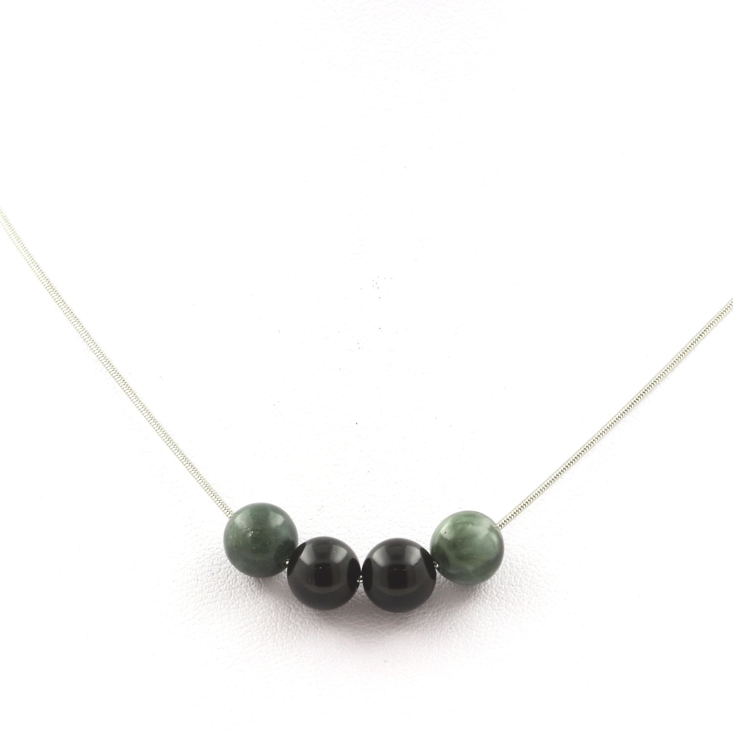 Collier perles Agate noire + Seraphinite de Russie 8 mm. Chaine en acier inoxydable.