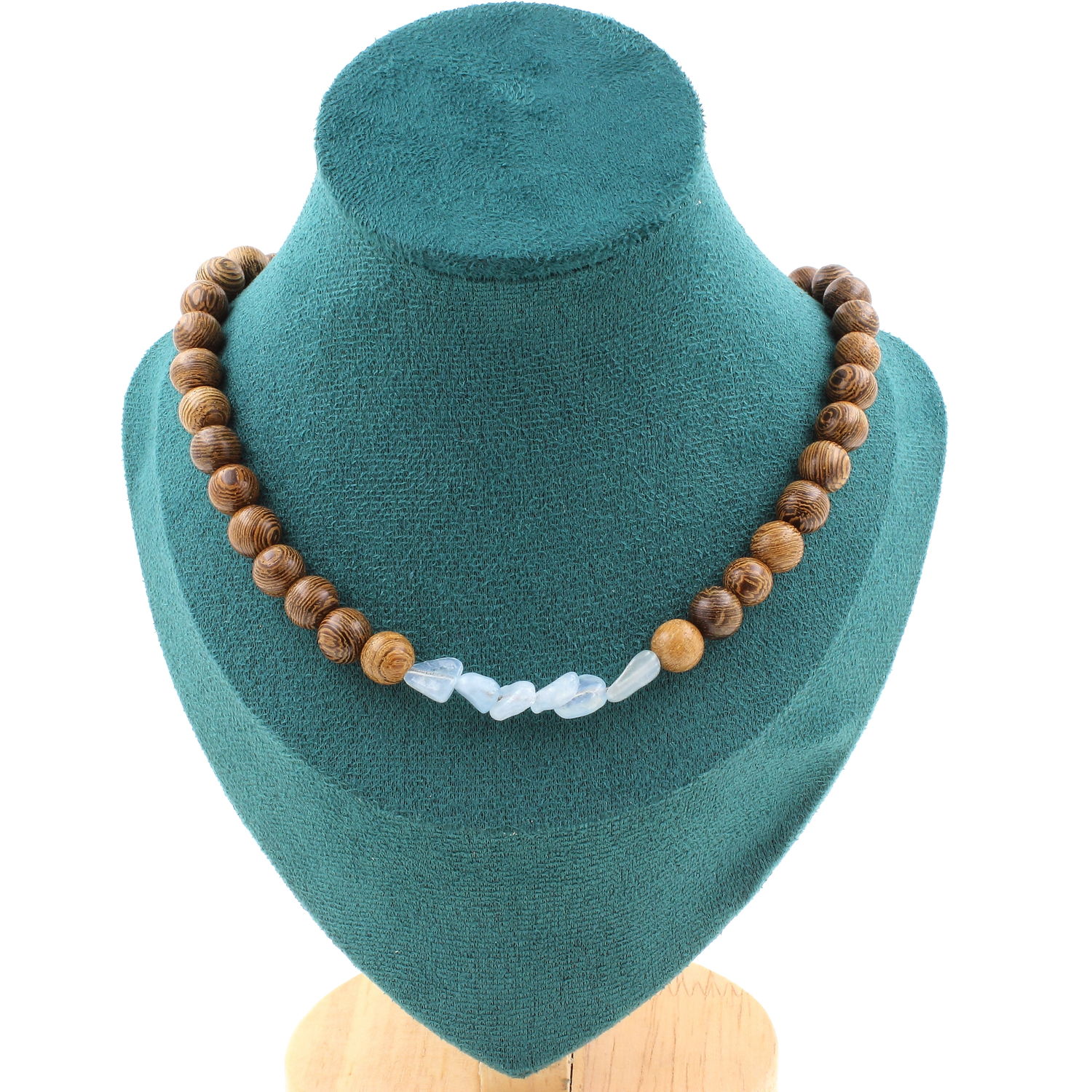 Collier perles Aigue-Marine du Brésil + bois 8 mm. Chaine en acier inoxydable.
