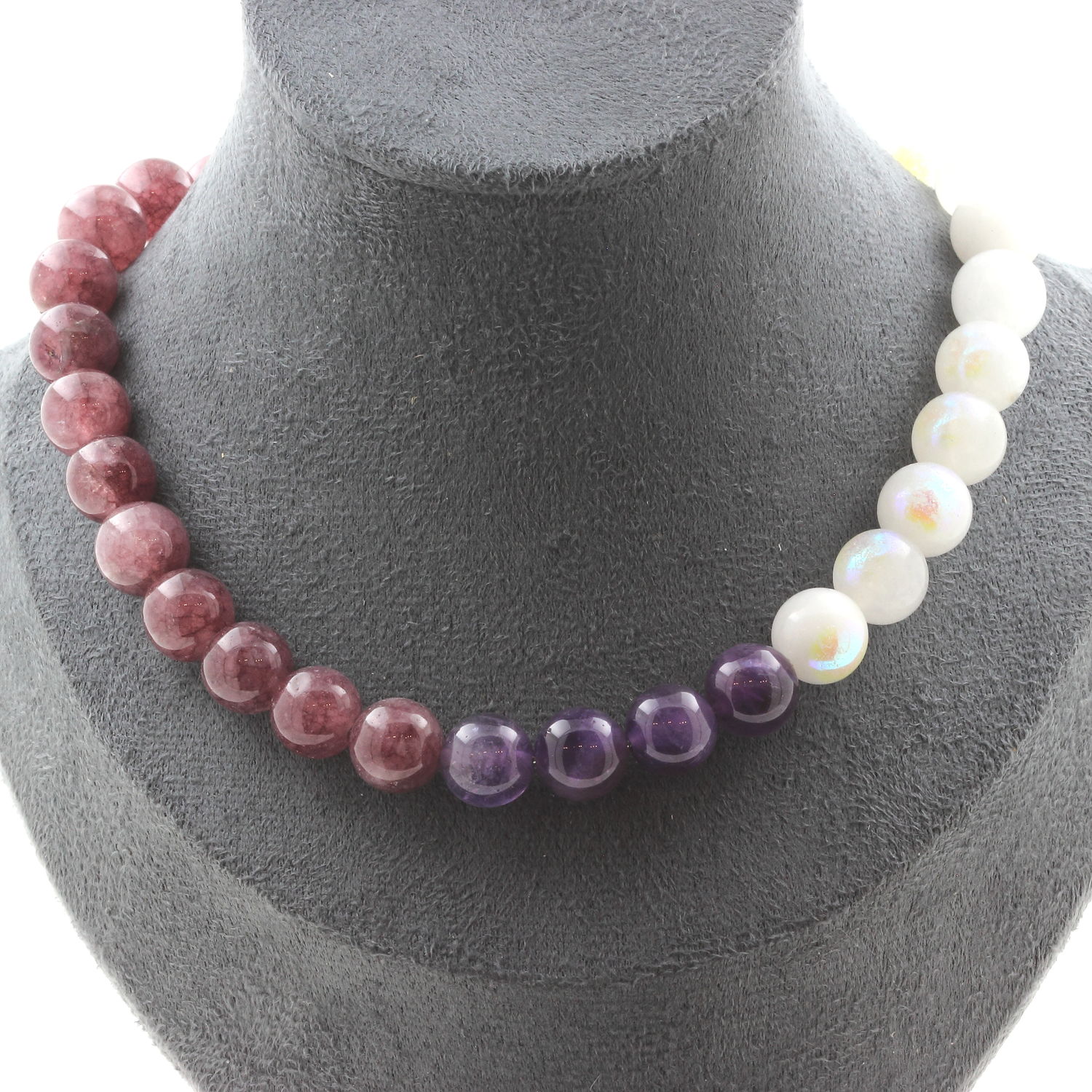 Collier perles Améthyste 10 mm + Pierre de lune 10 mm + Lépidolite 10 mm. Chaine en acier inoxydable.