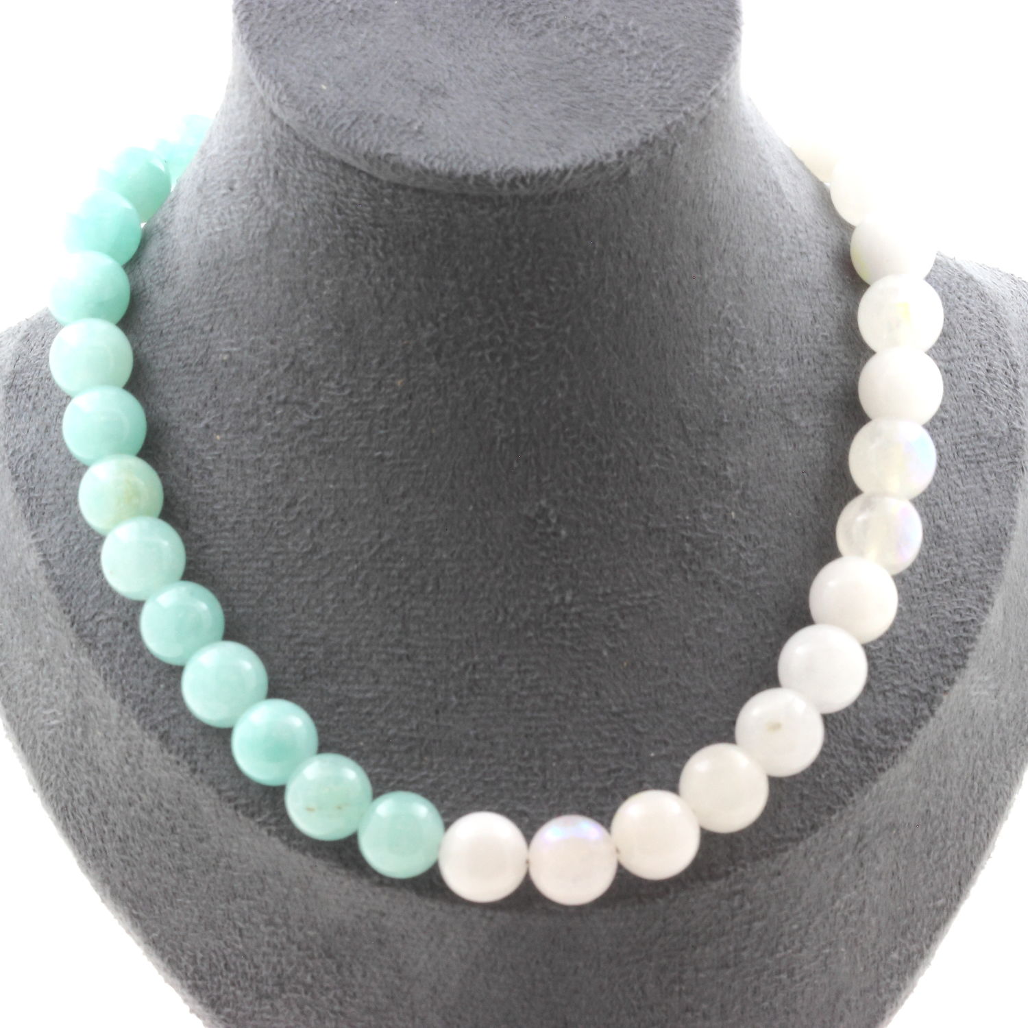 Collier perles Angélite 10 mm + Pierre de lune 10 mm. Chaine en acier inoxydable.