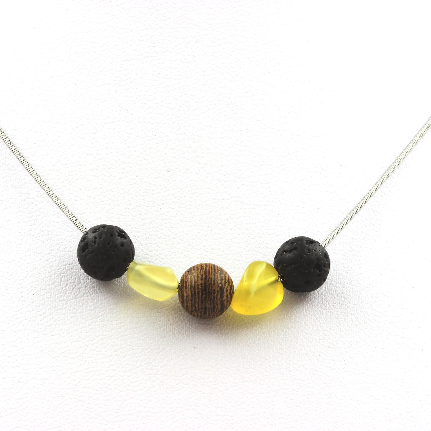 Collier perles bois 8 mm + Lave + Opale jaune d'Australie chaine en acier inoxydable ( longueur 40, 45, 50, 55, 60, 70, 80, 90 cm au choix ).