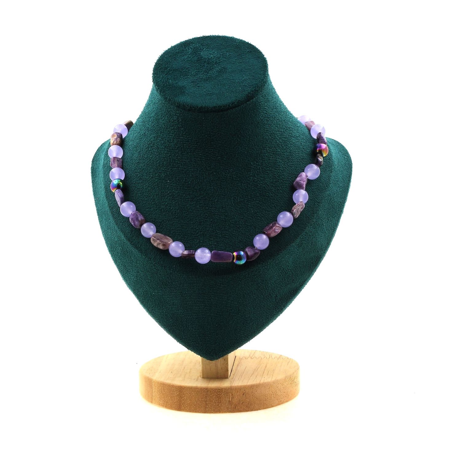 Collier perles Charoite de Russie + Calcédoine lavande + Hématite multicolore 8 mm Chaine en acier inoxydable