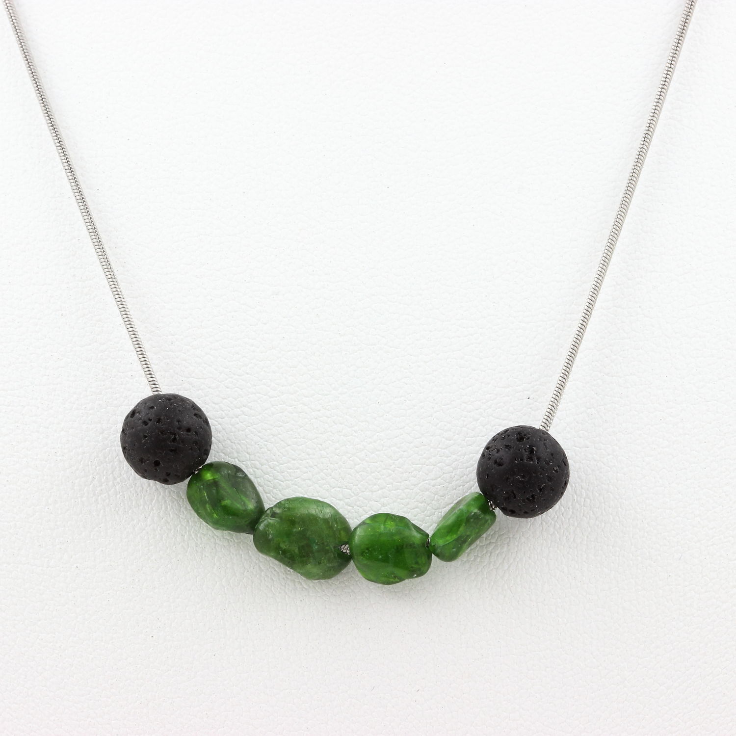 Collier perles Diopside du Brésil + Lave 8 mm. Chaine en acier inoxydable.