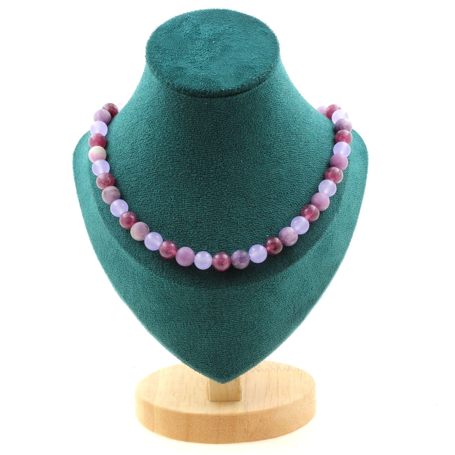 Collier perles Lépidolite + Calcédoine lavande + Mica violet mat 8 mm Chaine en acier inoxydable