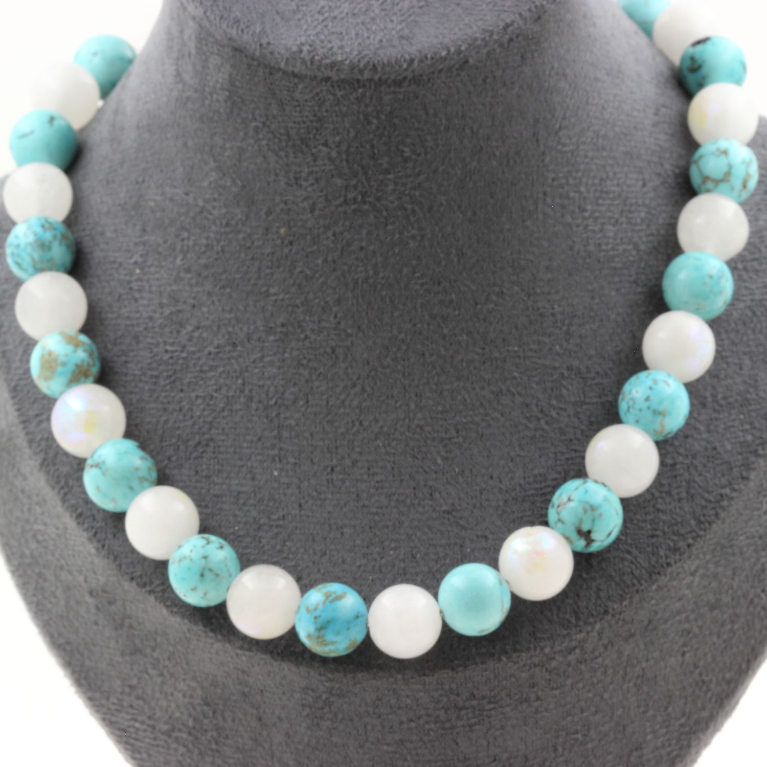 Collier perles Pierre de lune 10 mm + Howlite Turquoise 10 mm. Chaine en acier inoxydable.