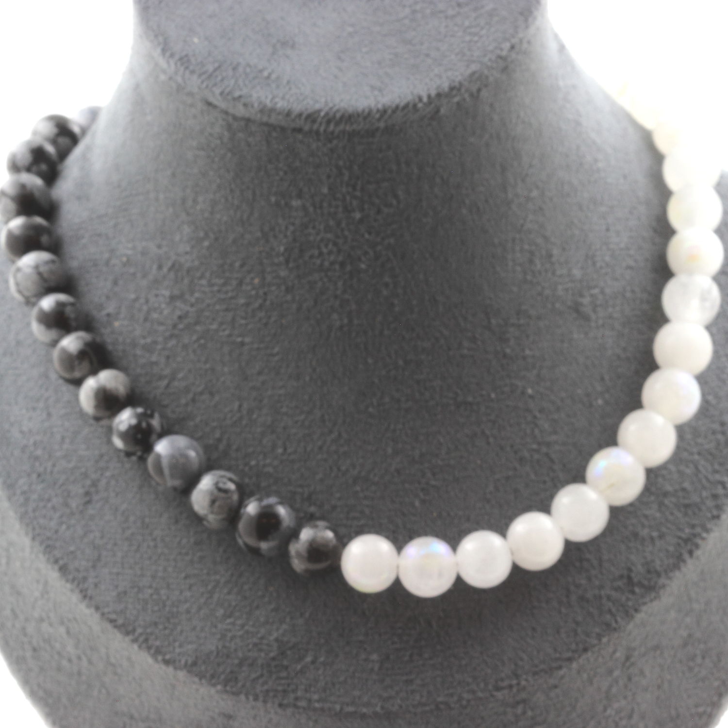 Collier perles Pierre de Lune + Obsidienne flocon de neige 8 mm. Chaine en acier inoxydable.