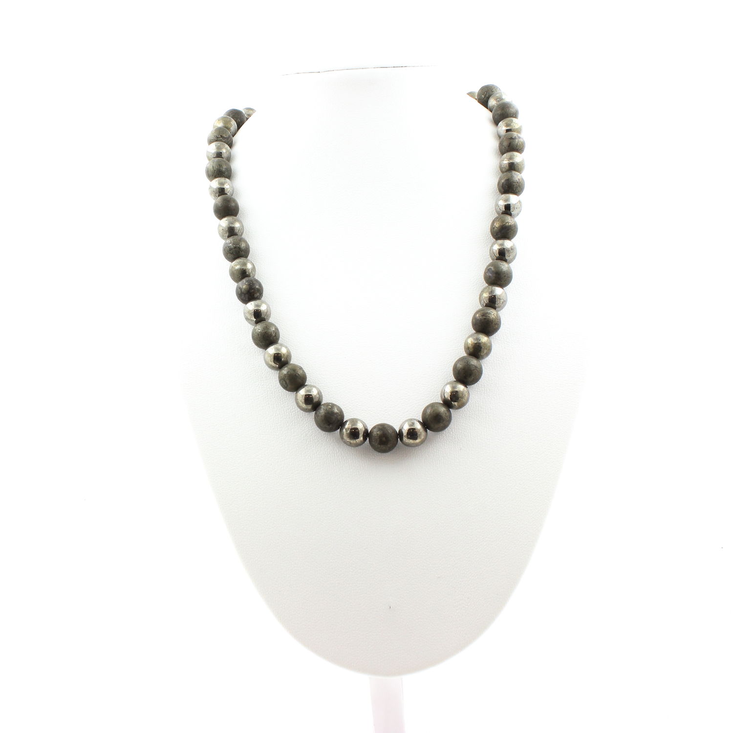 Collier perles Pyrite d'Espagne 8 mm chaine en acier inoxydable longueur 45 cm. Nous pouvons le fabriquer à votre longueur sur demande (prix variable selon la longueur du collier). Fabriqué en France dans notre atelier A Bijoux.