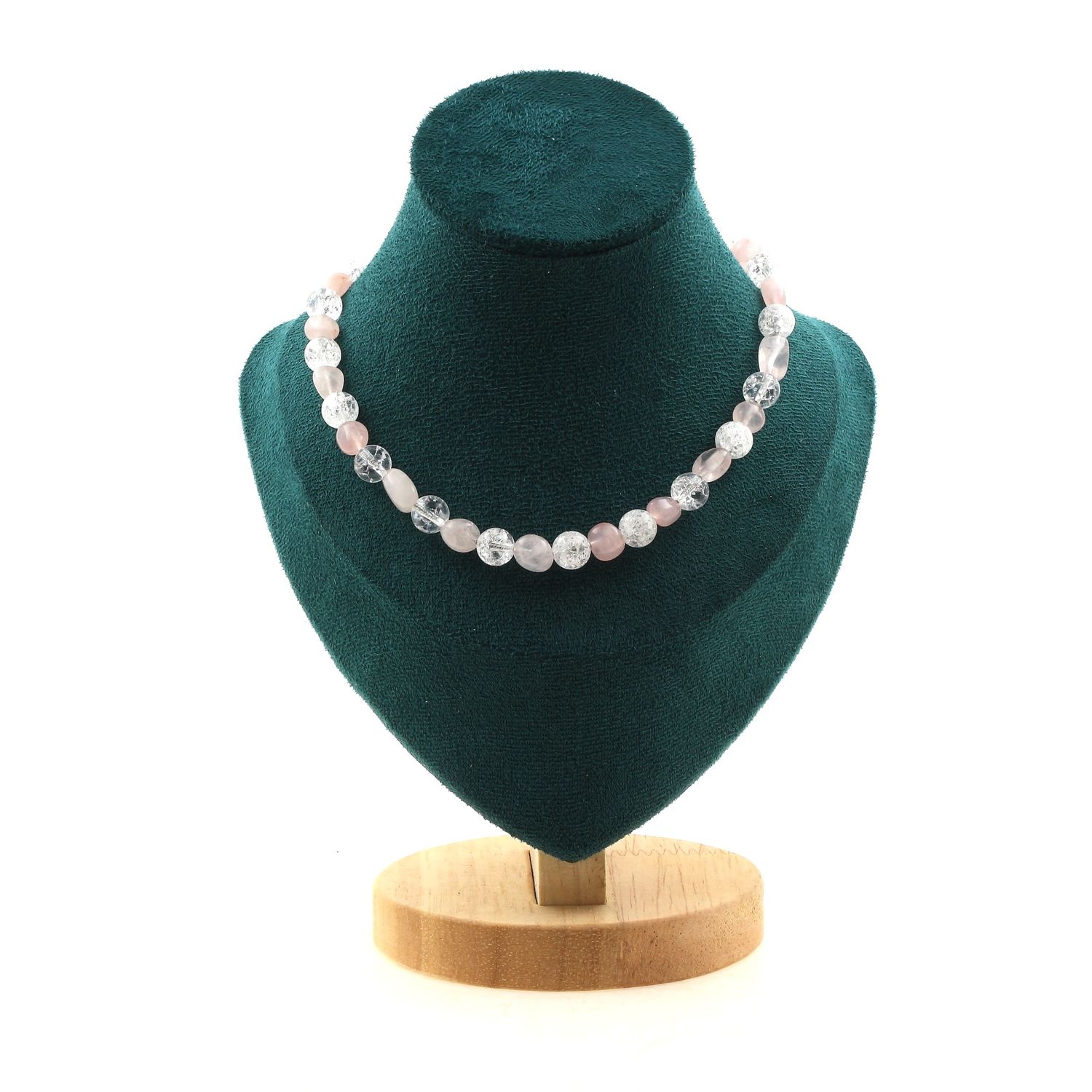 Collier perles Quartz rose du Brésil + Quartz craquelé du Brésil 8 mm Chaine en acier inoxydable