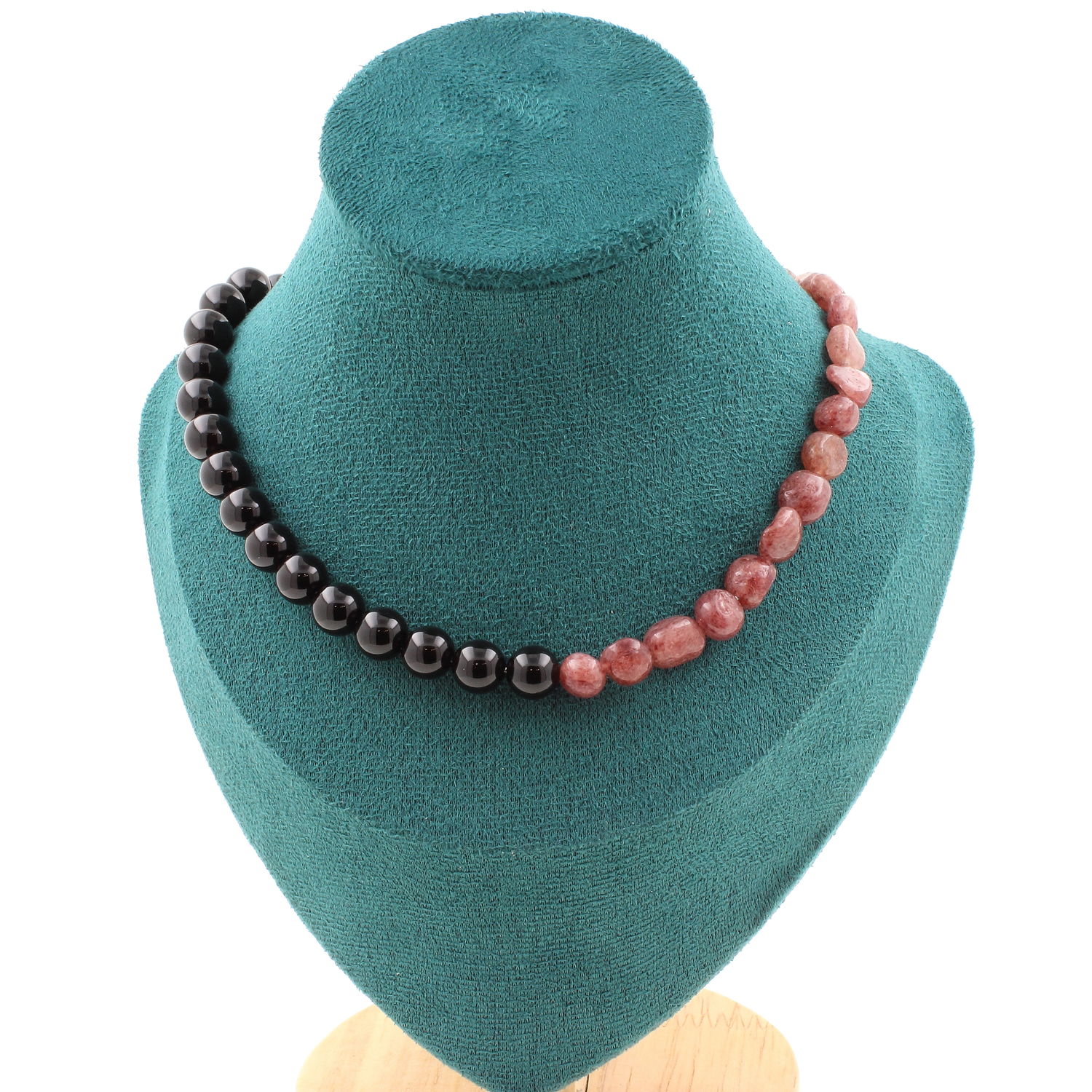 Collier perles Rubis du Brésil + Agate noire 8 mm. Chaine en acier inoxydable.