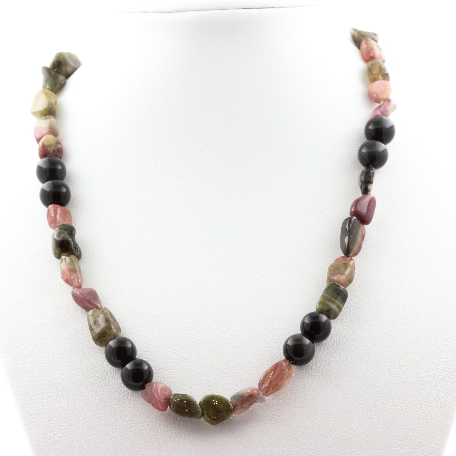 Collier perles Tourmaline multicolore du Brésil + Obsidienne noire 8 mm.