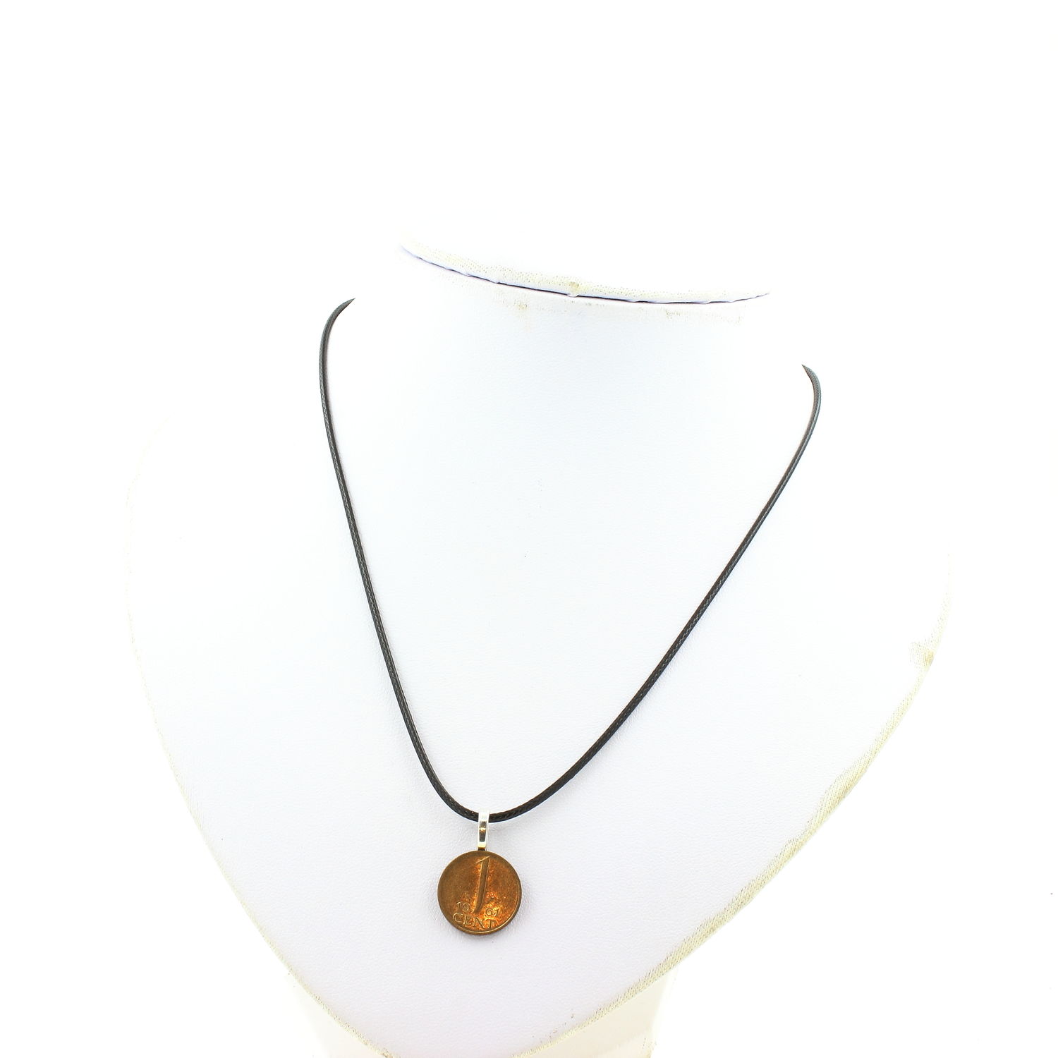 Pendentif Pièce de Monnaie Authentique Pays-Bas 1 cents Juliana + cordon cuir noir ( longueur 45 à 50 cm ).
