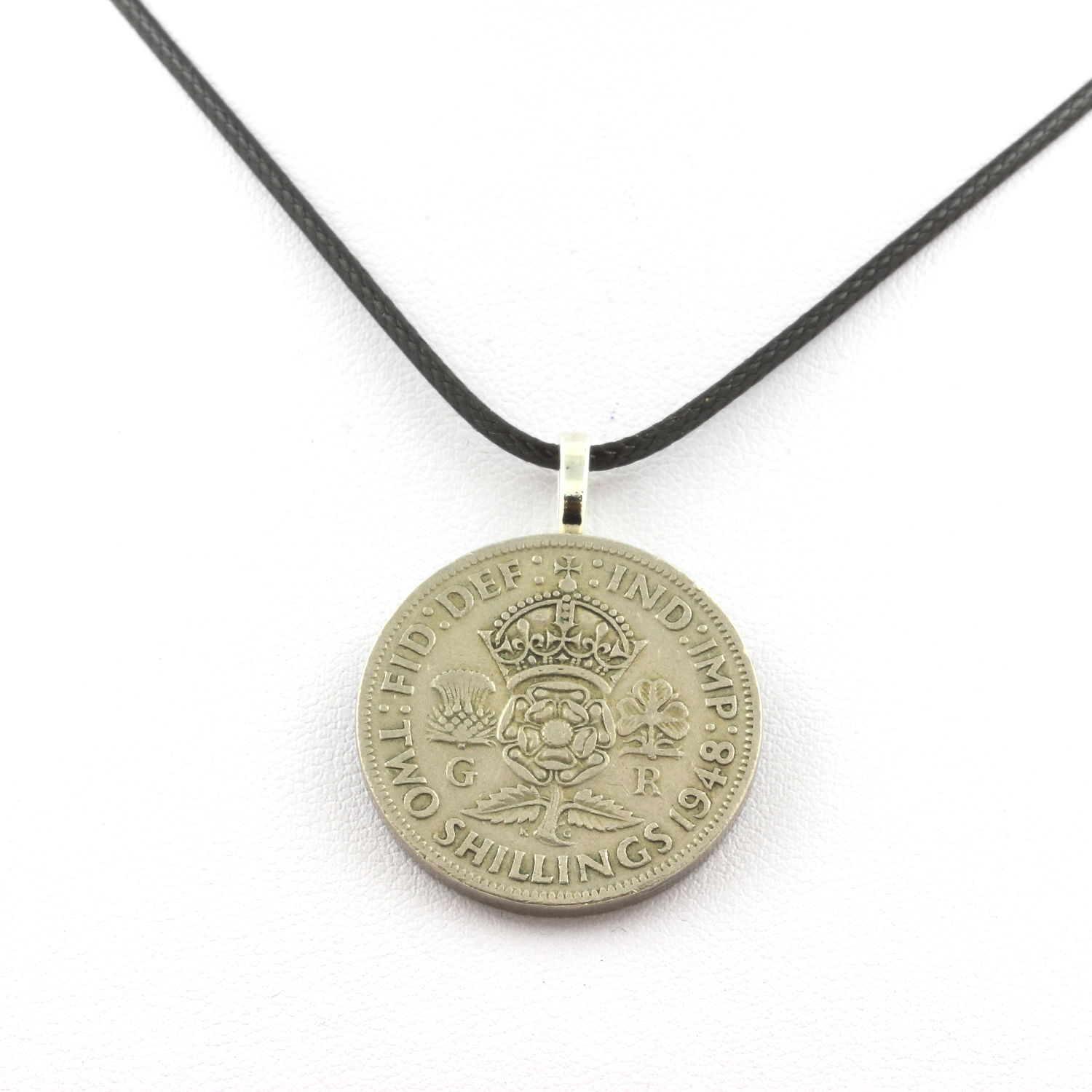 Pendentif Pièce de Monnaie Authentique Royaume-Uni 2 shillings George VI. + cordon cuir noir ( longueur 45 à 50 cm ).