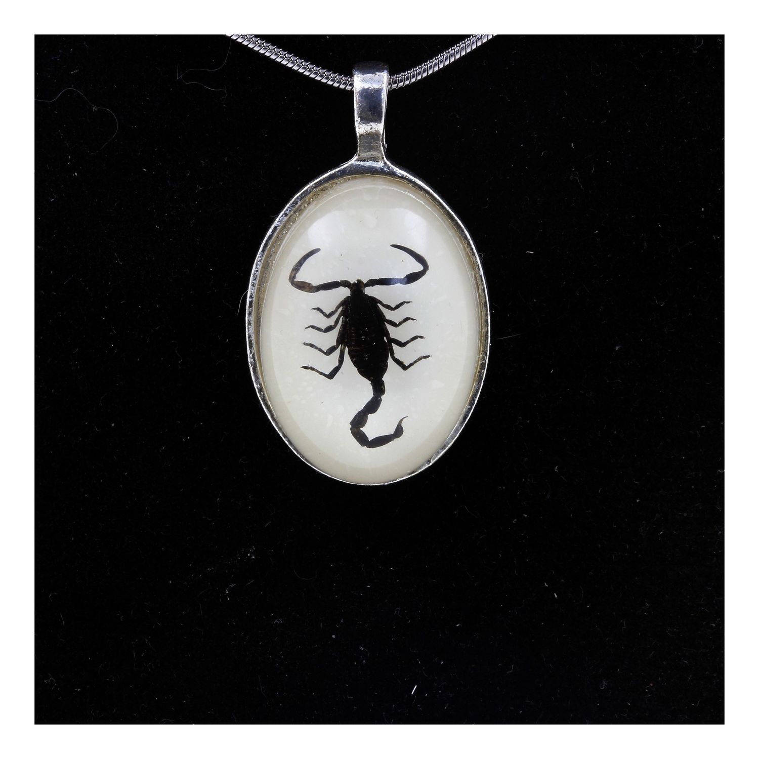 Collier en métal argenté + résine avec un véritable Scorpion + Chaîne en acier inoxydable longueur 40, 45, 50, 55, 60, 70, 80, 90 cm au choix.
