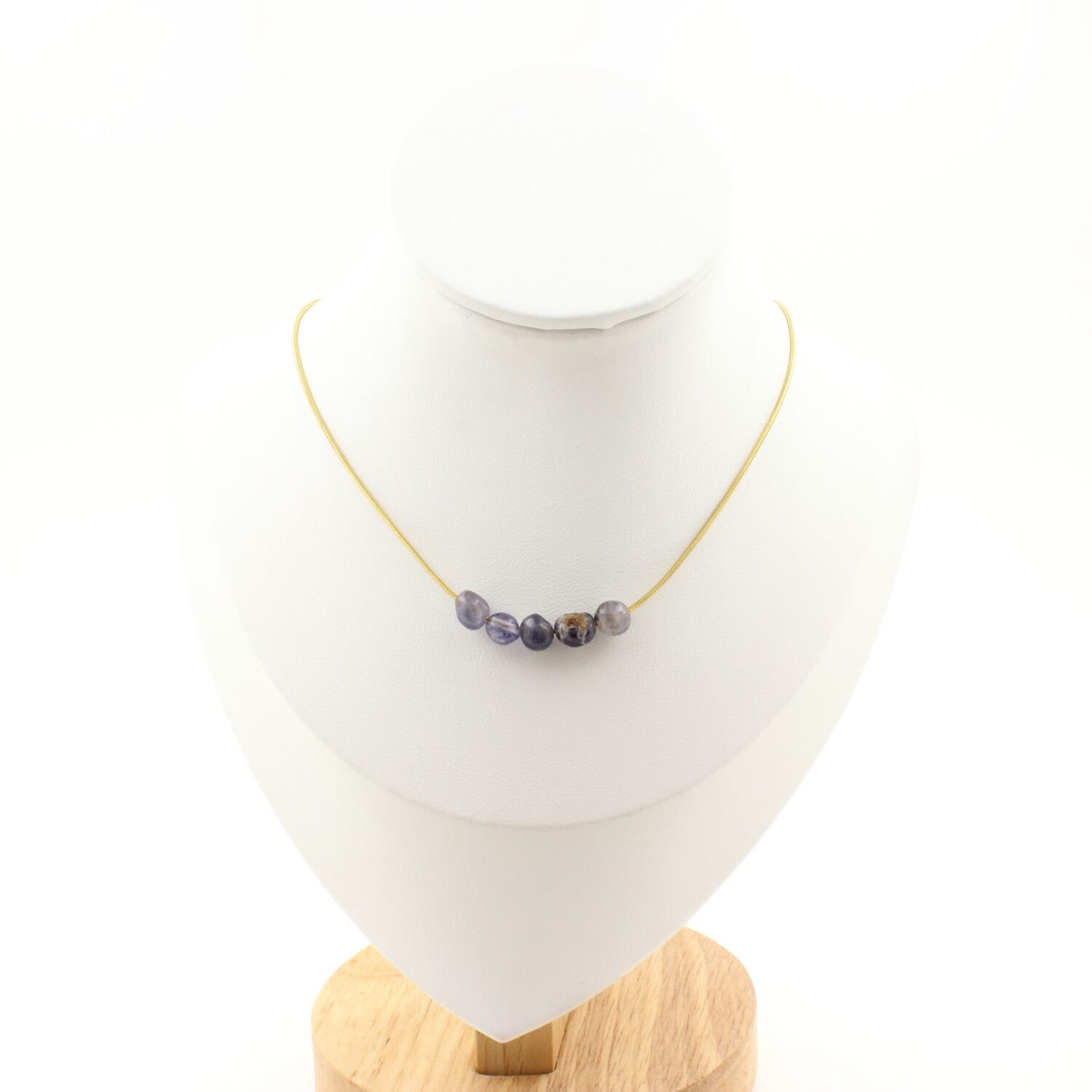Cordierite Iolite from Madagascar 5 beads necklace. Golden Stainless steel chain