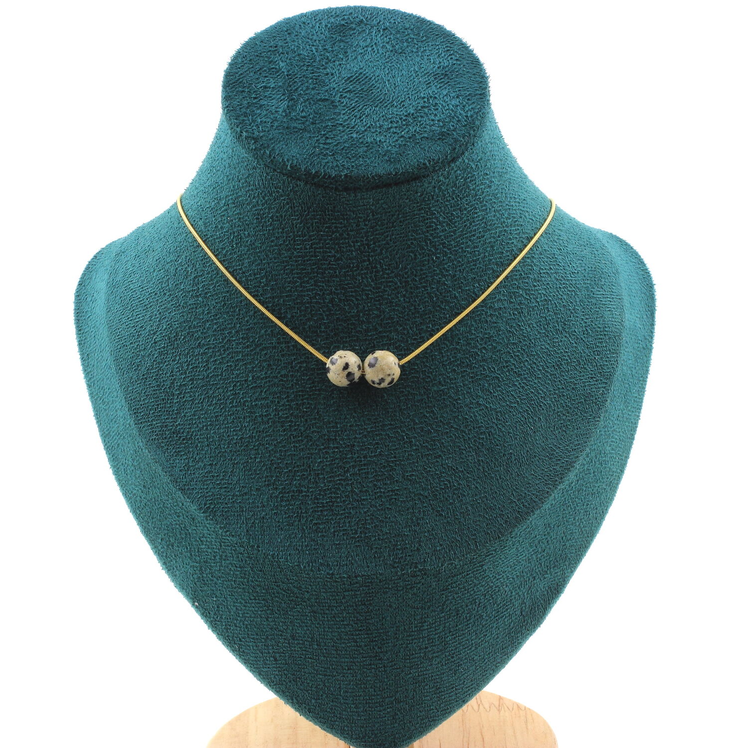 Dalmatian Jasper 8 mm 2 beads necklace, golden stainless steel chain length 45 cm. We can make it to your length on request. Made in France in our A Bijoux workshop. Delivered in a box pouch. Necklace for women, men, children. Discover more than 1000 models of necklaces made by the A Bijoux brand with new arrivals every day.
