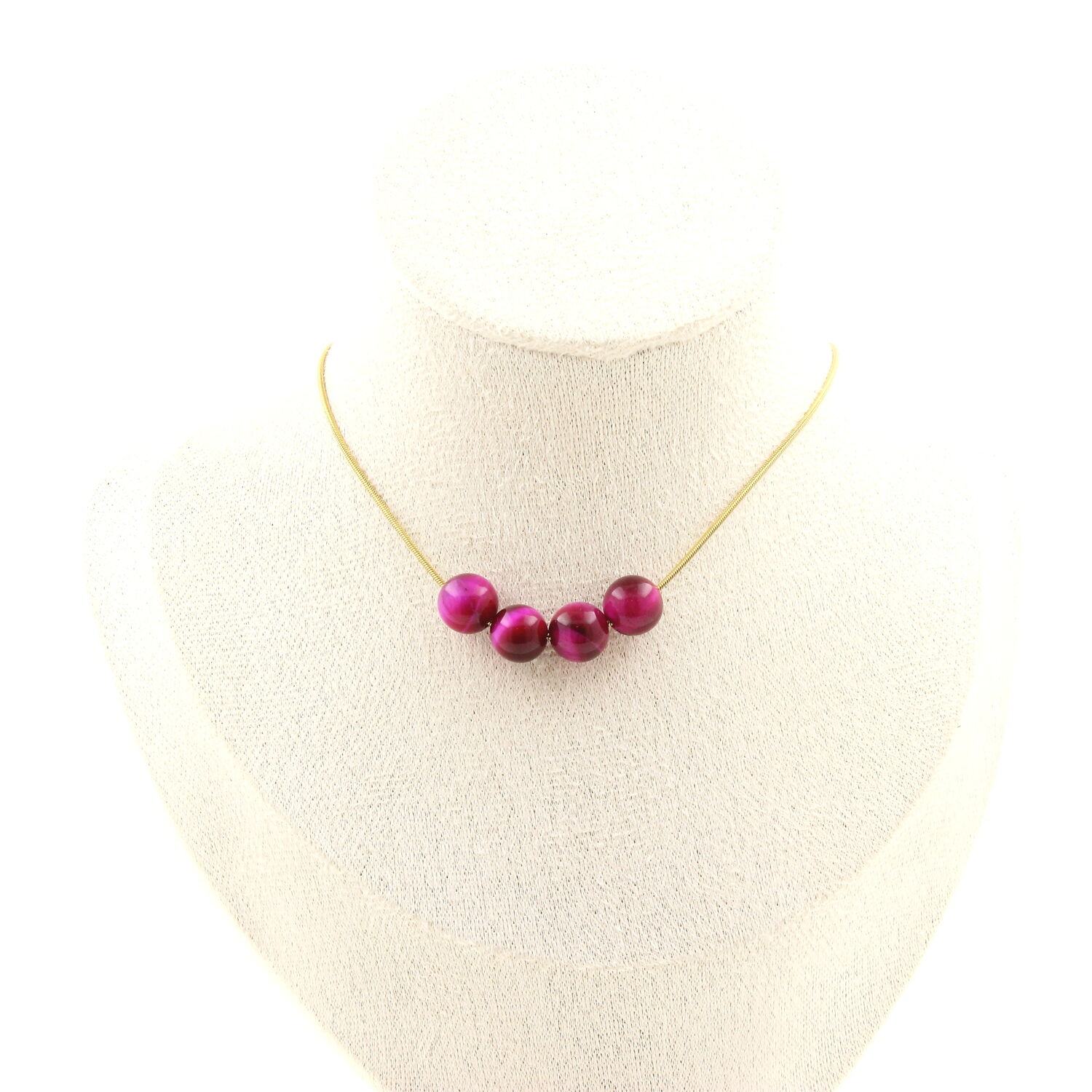 Fuschia Tiger's Eye 8 mm 4 beads necklace, golden stainless steel chain length 45 cm. We can make it to your length on request. Made in France in our A Bijoux workshop. Delivered in a box pouch. Necklace for women, men, children. Discover more than 1000 models of necklaces made by the A Bijoux brand with new arrivals every day.