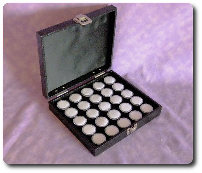 DESCRIPTION   Has 25 gem jars with White foam. White case measures 30 x 28 x 16 mm