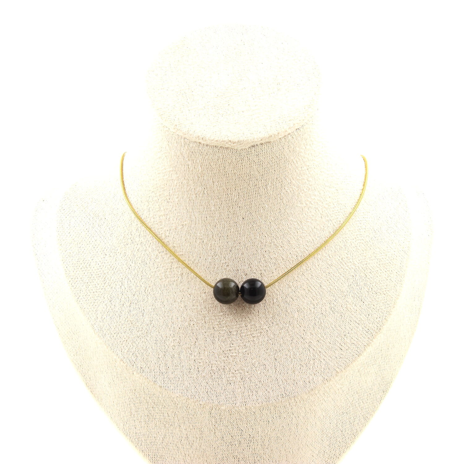 Golden Obsidian 8 mm 2 beads necklace, golden stainless steel chain length 45 cm. We can make it to your length on request. Made in France in our A Bijoux workshop. Delivered in a box pouch. Necklace for women, men, children. Discover more than 1000 models of necklaces made by the A Bijoux brand with new arrivals every day.