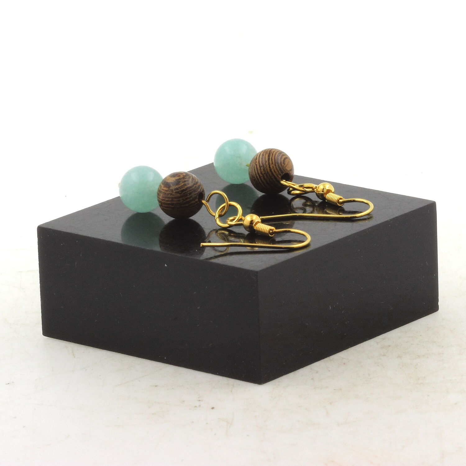 Golden Stainless steel hypoallergenic Earrings Amazonite + wood 8 mm 2 Beads.