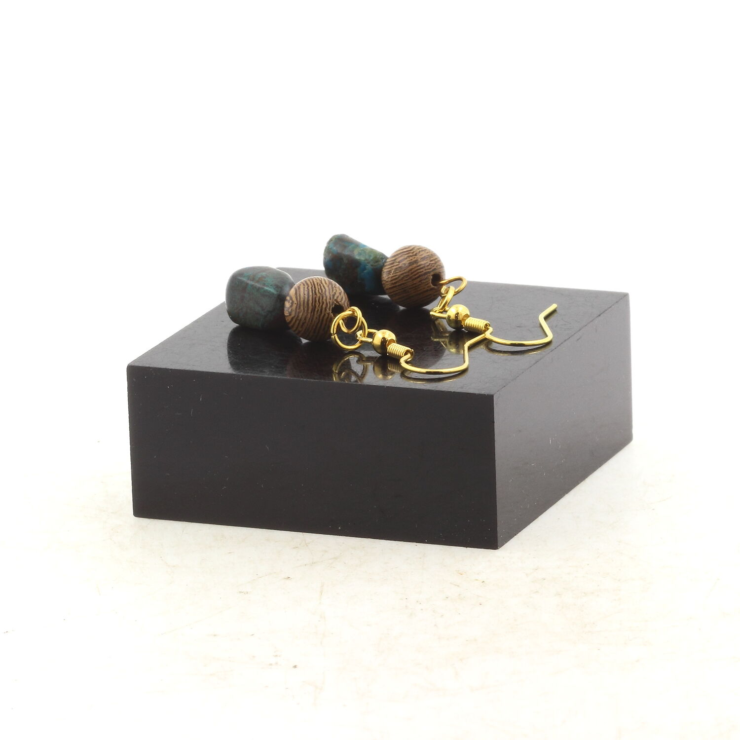 Golden Stainless steel hypoallergenic Earrings Chrysocolla from the USA Freeform 5mm-8mm + wood 8 mm 2 Beads.