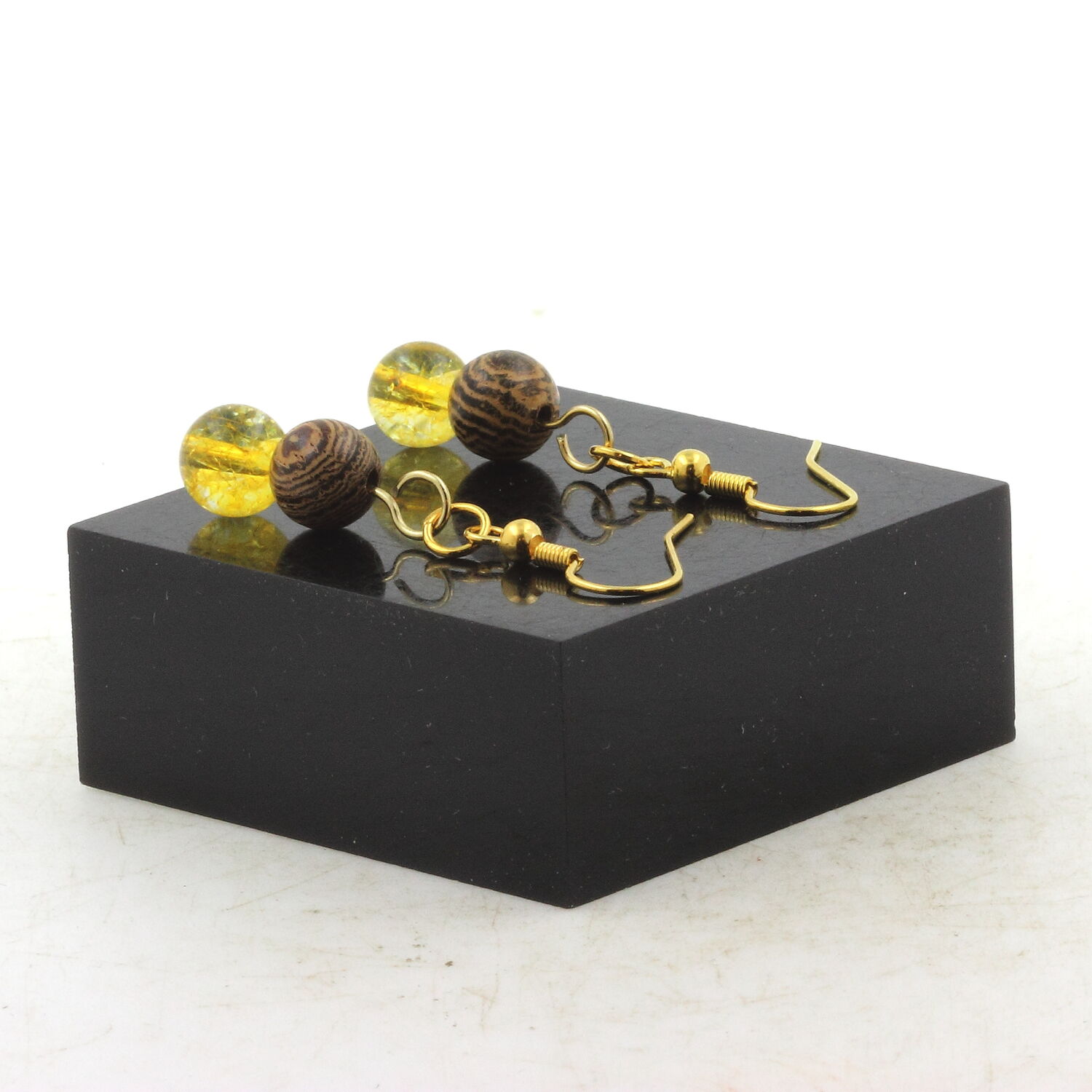 Golden Stainless steel hypoallergenic Earrings Citrine + wood 8 mm 2 Beads.