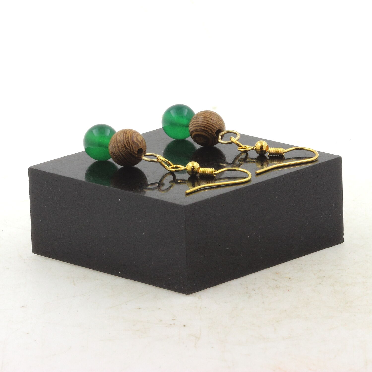 Golden Stainless steel hypoallergenic Earrings Green Agate + wood 8 mm 2 Beads.