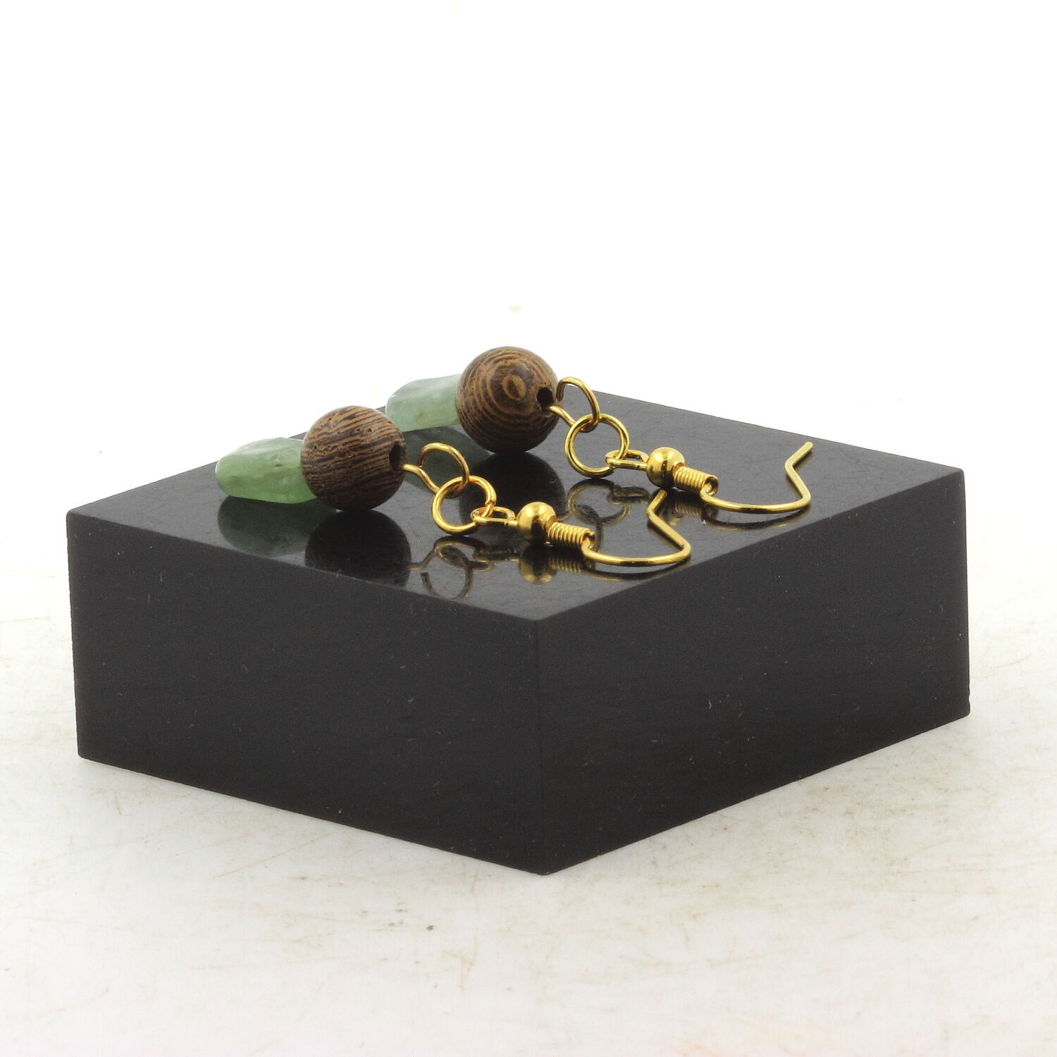 Golden Stainless steel hypoallergenic Earrings Green Kyanite from Brazil Freeform 5mm-8mm + wood 8 mm 2 Beads.