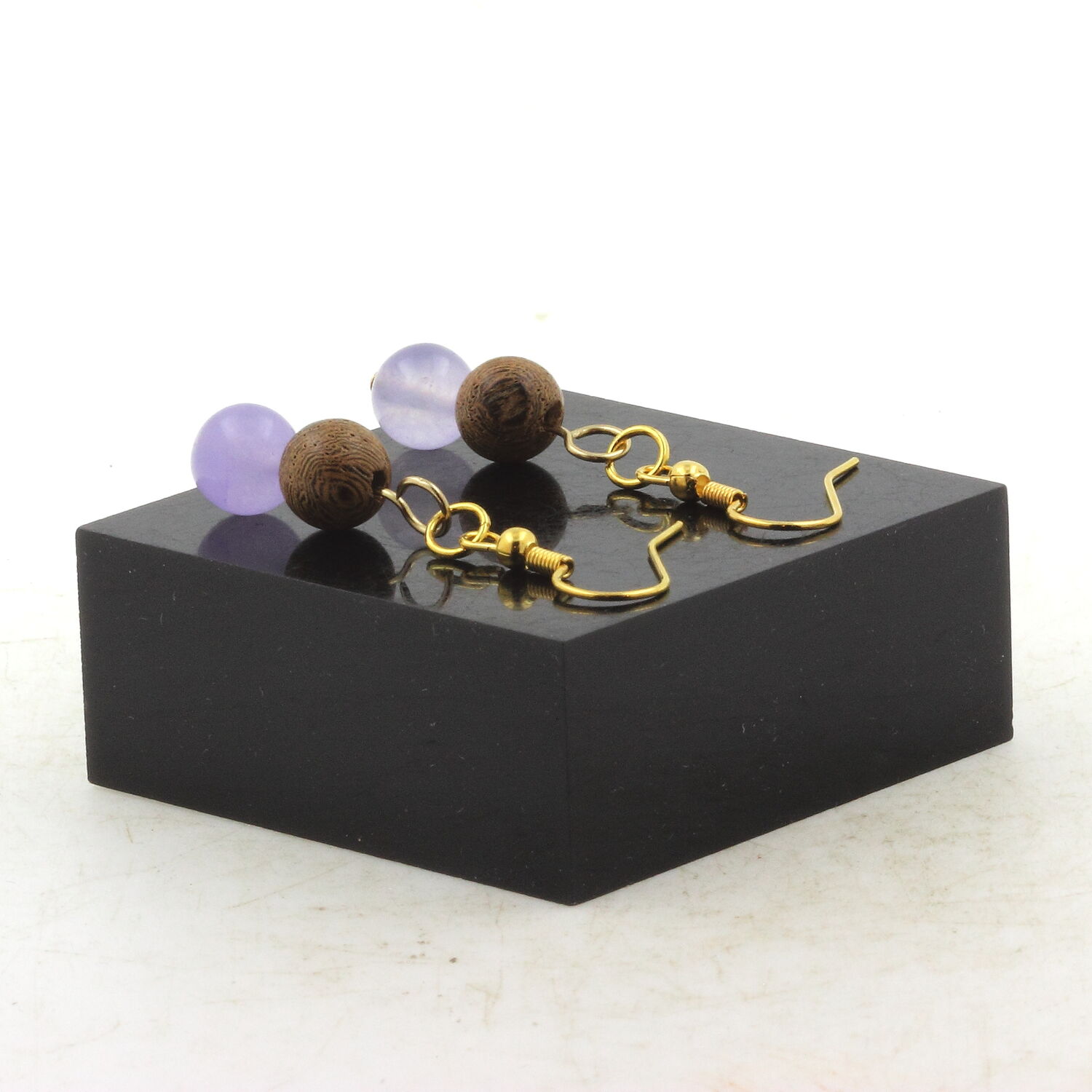 Golden Stainless steel hypoallergenic Earrings Lavender Chalcedony + wood 8 mm 2 Beads.