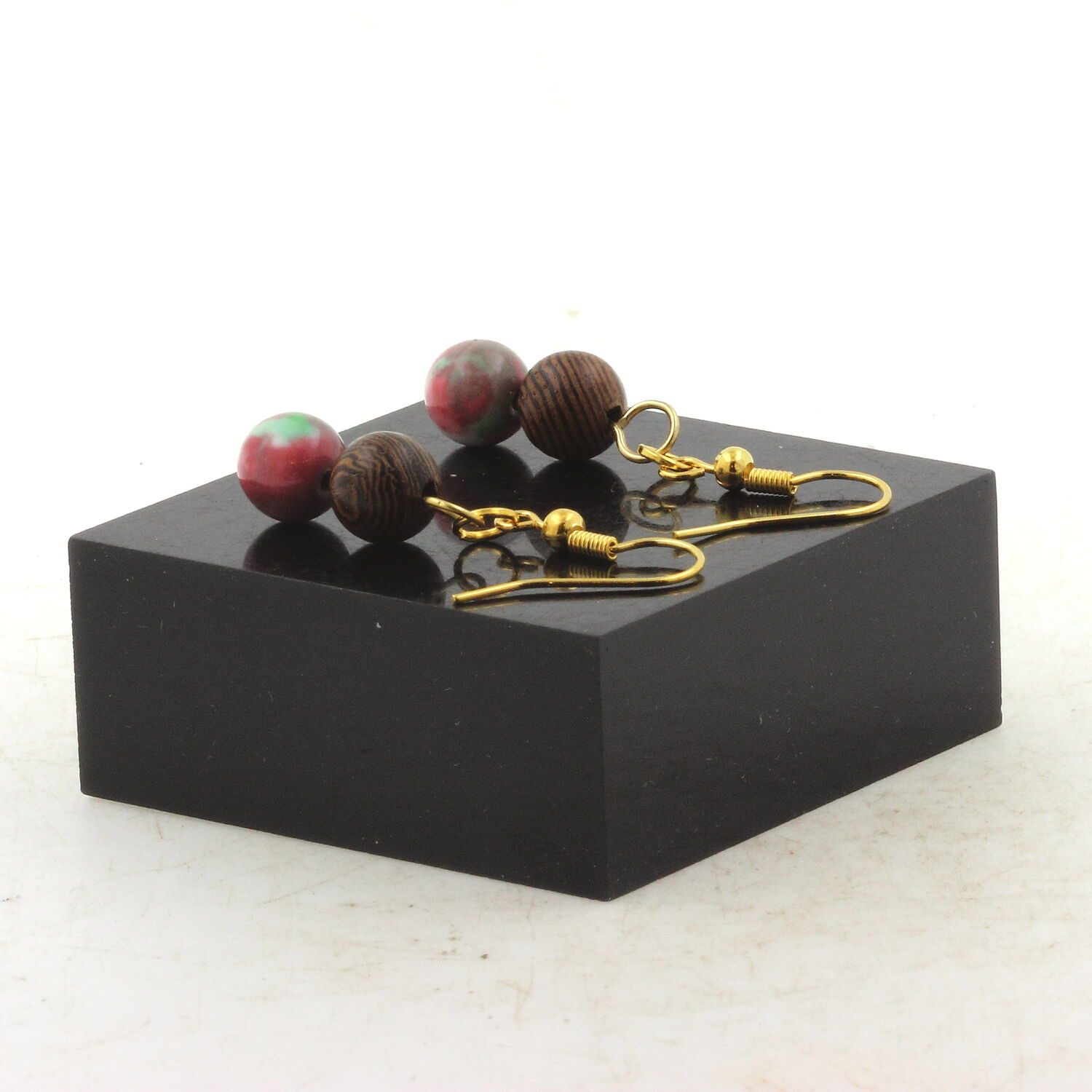 Golden Stainless steel hypoallergenic Earrings Red green Jasper + wood 8 mm 2 Beads.