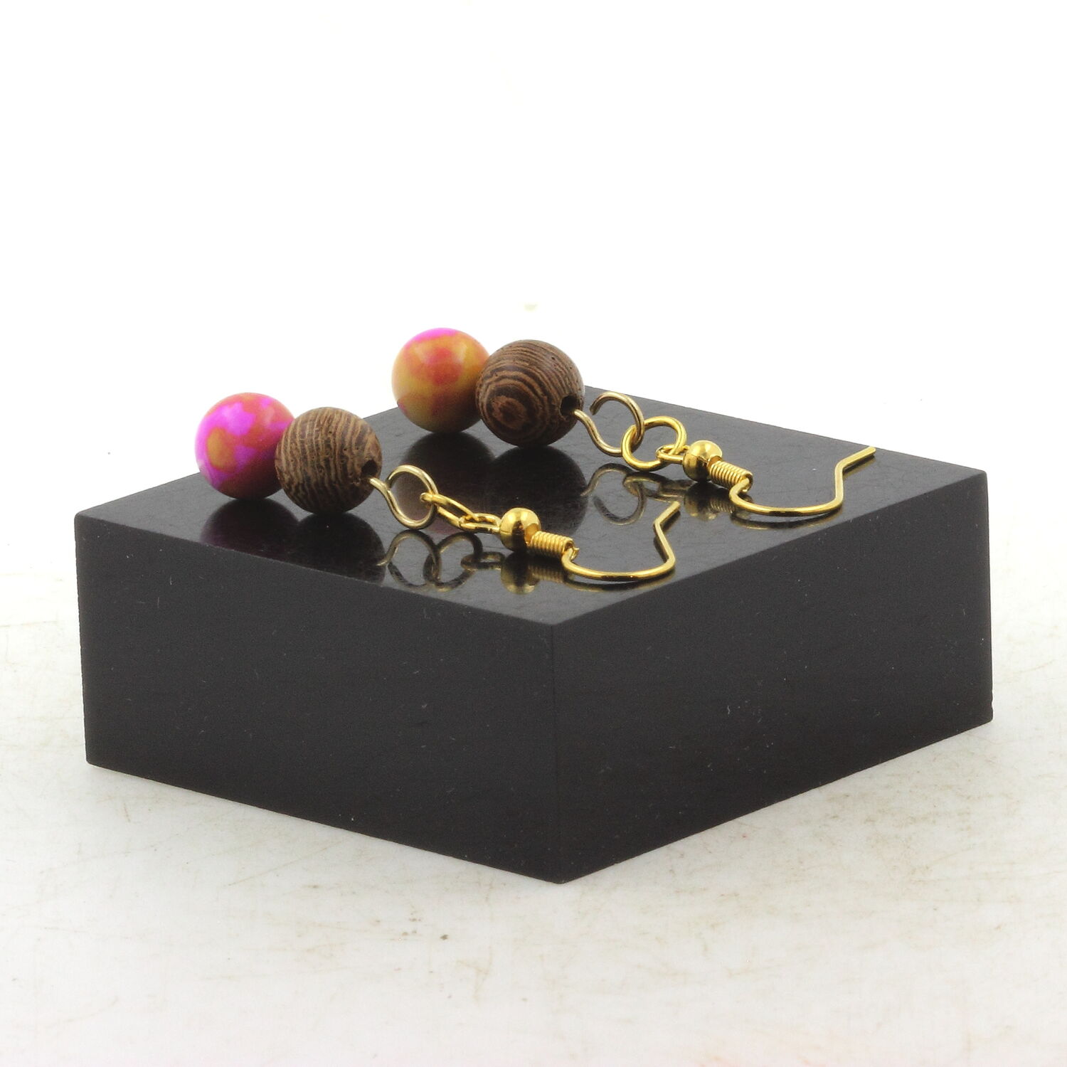 Golden Stainless steel hypoallergenic Earrings Yellow pink Jasper + wood 8 mm 2 Beads.