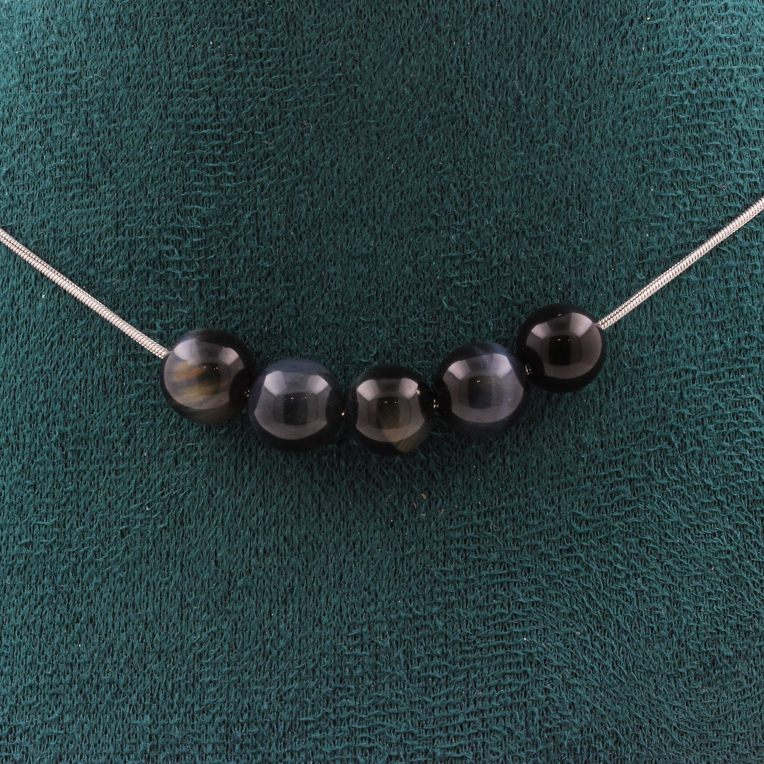 Hawk Eye 8 mm 5 beads necklace, stainless steel chain length 45 cm. We can make it to your length on request. Made in France in our A Bijoux workshop. Delivered in a box pouch. Necklace for women, men, children. Discover more than 1000 models of necklaces made by the A Bijoux brand with new arrivals every day.