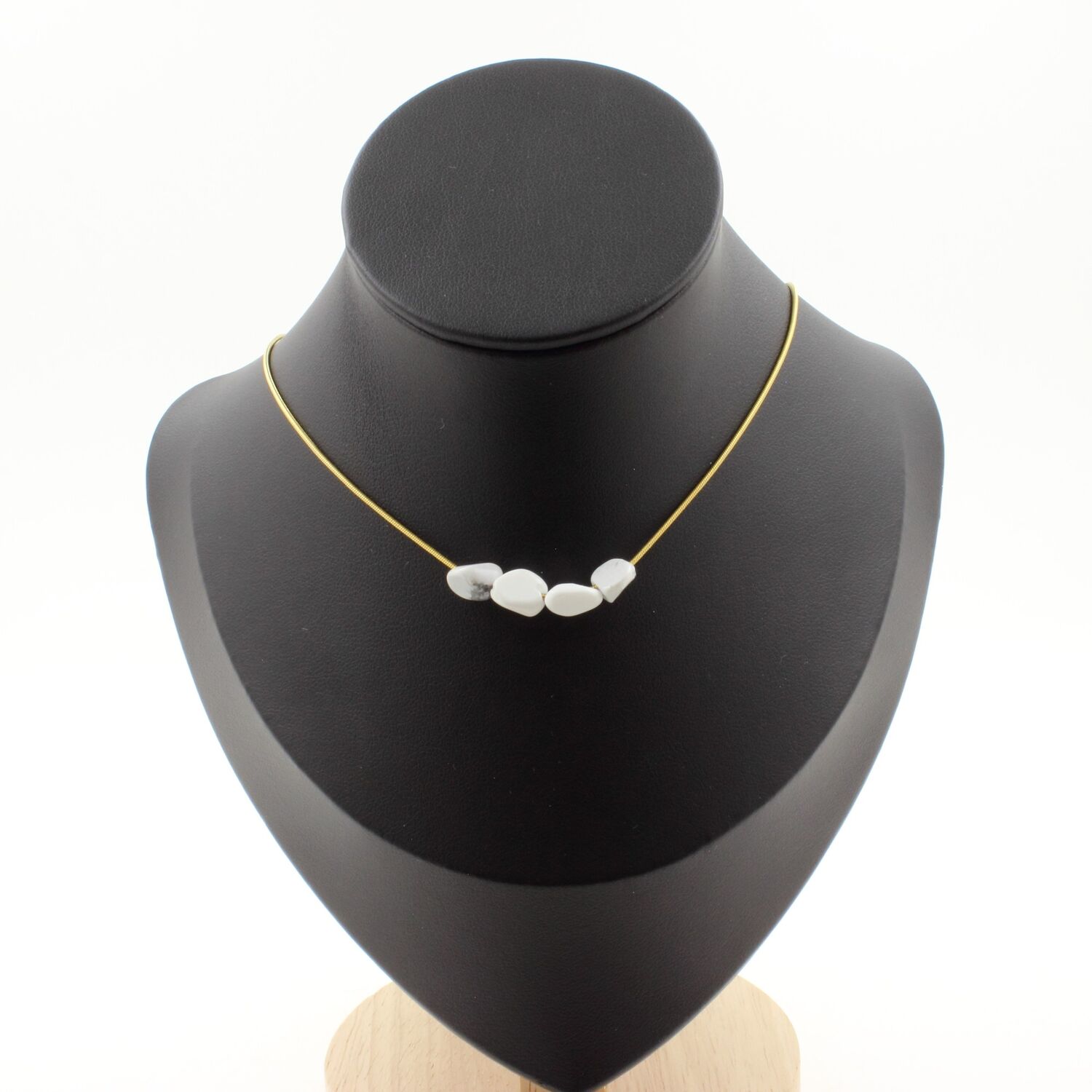 Howlite from the USA 4 beads necklace, golden stainless steel chain length 45 cm. We can make it to your length on request. Made in France in our A Bijoux workshop. Delivered in a box pouch. Necklace for women, men, children. Discover more than 1000 models of necklaces made by the A Bijoux brand with new arrivals every day.