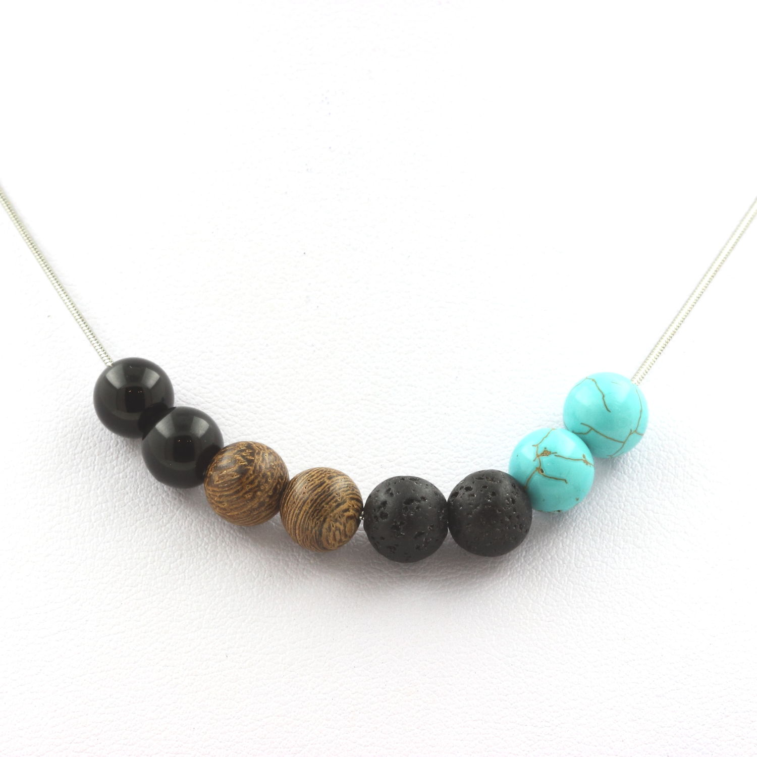 Howlite Turquoise + Lava + Black Agate + wood 8 mm beaded necklace, stainless steel chain length 45 cm. We can make it to your length on request. Made in France in our A Bijoux workshop. Delivered in a box pouch. Necklace for women, men, children. Discover more than 1000 models of necklaces made by the A Bijoux brand with new arrivals every day.