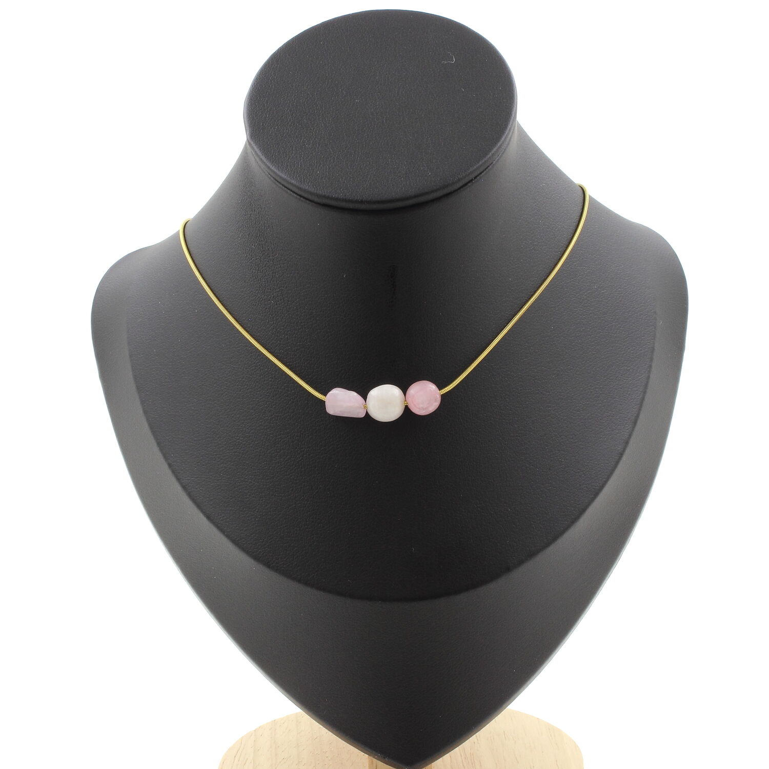 Kunzite from Brazil 3 beads necklace, golden stainless steel chain length 45 cm. We can make it to your length on request. Made in France in our A Bijoux workshop. Delivered in a box pouch. Necklace for women, men, children. Discover more than 1000 models of necklaces made by the A Bijoux brand with new arrivals every day.