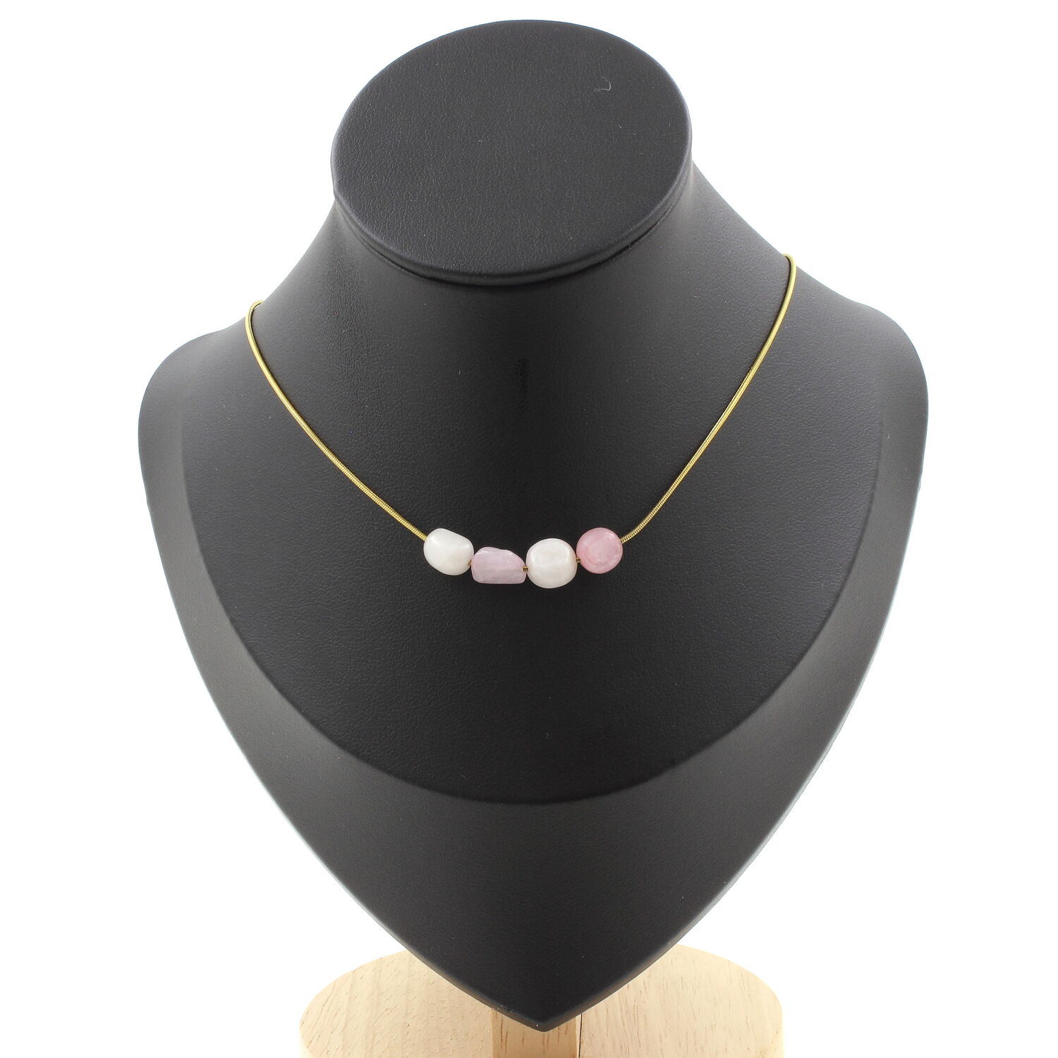 Kunzite from Brazil 4 beads necklace, golden stainless steel chain length 45 cm. We can make it to your length on request. Made in France in our A Bijoux workshop. Delivered in a box pouch. Necklace for women, men, children. Discover more than 1000 models of necklaces made by the A Bijoux brand with new arrivals every day.