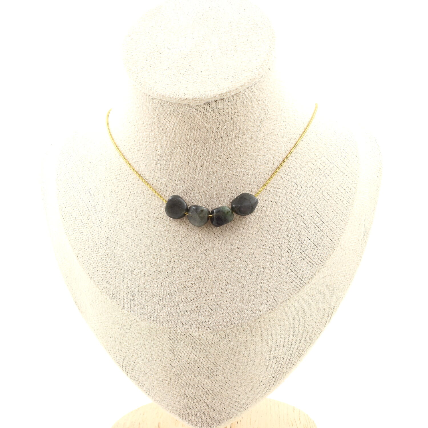 Labradorite from Finland 4 beads necklace, golden stainless steel chain length 45 cm. We can make it to your length on request (price varies depending on the length of the necklace). Made in France in our A Bijoux workshop. Delivered in a box pouch. Necklace for women, men, children. Discover more than 1000 models of necklaces made by the A Bijoux brand with new arrivals every day.